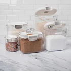 About this item Airtight Seal for Long-Lasting Freshness – Each container is equipped with a silicone seal and stainless steel latch to lock in freshness and protect dry ingredients from air and moisture. Perfect for maintaining the texture and shelf life of flour, sugar, and more. Custom-Fit Design for Essential Baking Ingredients – Includes 5 specialized containers to hold standard ingredient bag sizes: the Flour Keeper (4.36 qt., 8"x6"x9.5") fits a 5 lb bag and includes a built-in magnetic leveling bar; the Sugar Keeper (2.5 qt., 6.125"x7.75"x8.5") fits a 4 lb bag with a flip-to-pour spout and contoured shape; the Brown Sugar Keeper (1.5 qt., 6"x5.5"x5.625") holds 2 lbs and includes a terra cotta disk to prevent clumping; the Powdered Sugar Keeper (2.04 qt., 7.125"x5.25"x6.5") holds 2 lbs and features a removable magnetic dusting spoon; and the Mini Keeper (0.41 qt., 4"x3.5"x4.25") is ideal for baking soda, spices, or sprinkles and includes a shaker/leveler. Accessory-Rich for Smart Storage – Comes with built-in magnetic tools like a leveling bar, measuring/dusting spoon, and removable terra cotta tamper to keep brown sugar soft. All accessories store neatly under each lid for space-saving efficiency. Clear, Stackable & Easy to Use – Transparent BPA-free canisters offer clear visibility of contents and measurement markings for accurate prep. Stackable design helps optimize pantry space and stainless steel hinges provide smooth, wide-lid opening for easy access. Built for Daily Use & Easy Cleaning – All pieces are BPA-free, feature an easy-catch latch for secure sealing, and are top-rack dishwasher safe for fast and effortless cleanup. Color: White Material: Plastic Material Feature: BPA Free, Dishwasher Safe, Food Grade Capacity: 4.36 Quarts