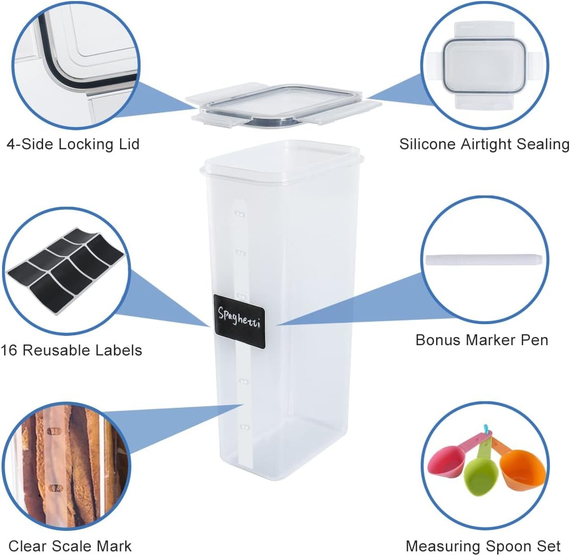 About this item Set of 24 BPA-free plastic food containers in 4 sizes keep dry goods fresh Airtight lids ensure secure seal to preserve foods and prevent spills Stackable, space-saving square design fits neatly on shelves and counters Dishwasher-safe construction allows for easy cleaning Includes labels, marker, and measuring spoons for organizing ingredients › Brand: Color: 24-Pack Material: Plastic Material Feature: BPA Free, Dishwasher Safe, Reusable Capacity: 0.85 Liters