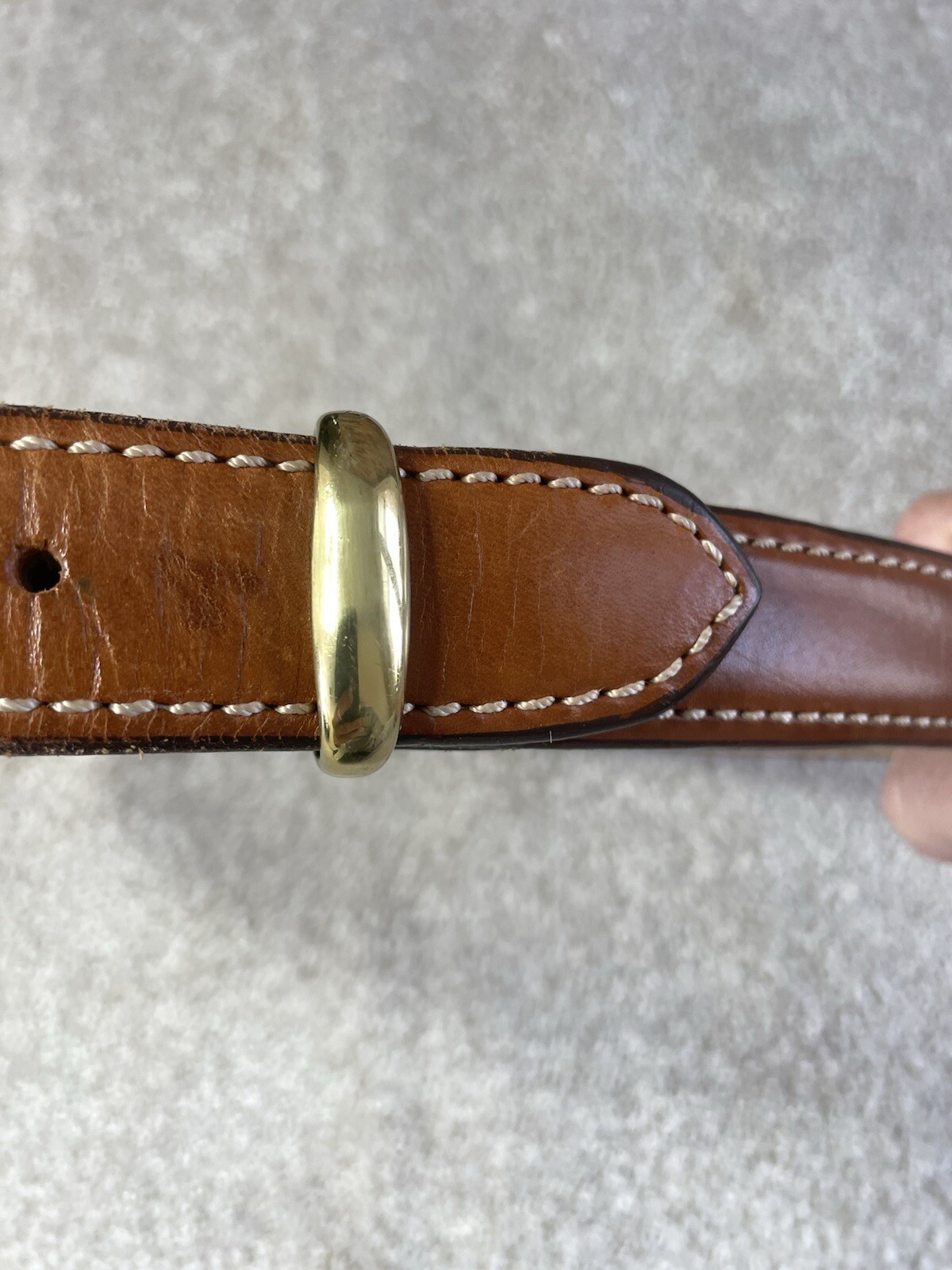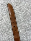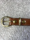 The Aker Leather Belt B22-38 is a sturdy and reliable men's belt designed for concealed carry purposes. Made in the United States, this tan belt features a solid pattern with brass hardware, giving it a stylish and durable look. With a width of 1.25 inches, this reinforced tactical belt is suitable for daily wear and offers the necessary support for carrying items securely. Perfect for those seeking both functionality and style in their belt choice, the Aker Leather Belt B22-38 is a top choice for individuals looking for a high-quality accessory. No, there are few minor scratches on the belt buckle otherwise the belts in very good condition. The actual measurements of the belt is one and 1/4” x 42 1/4 long.