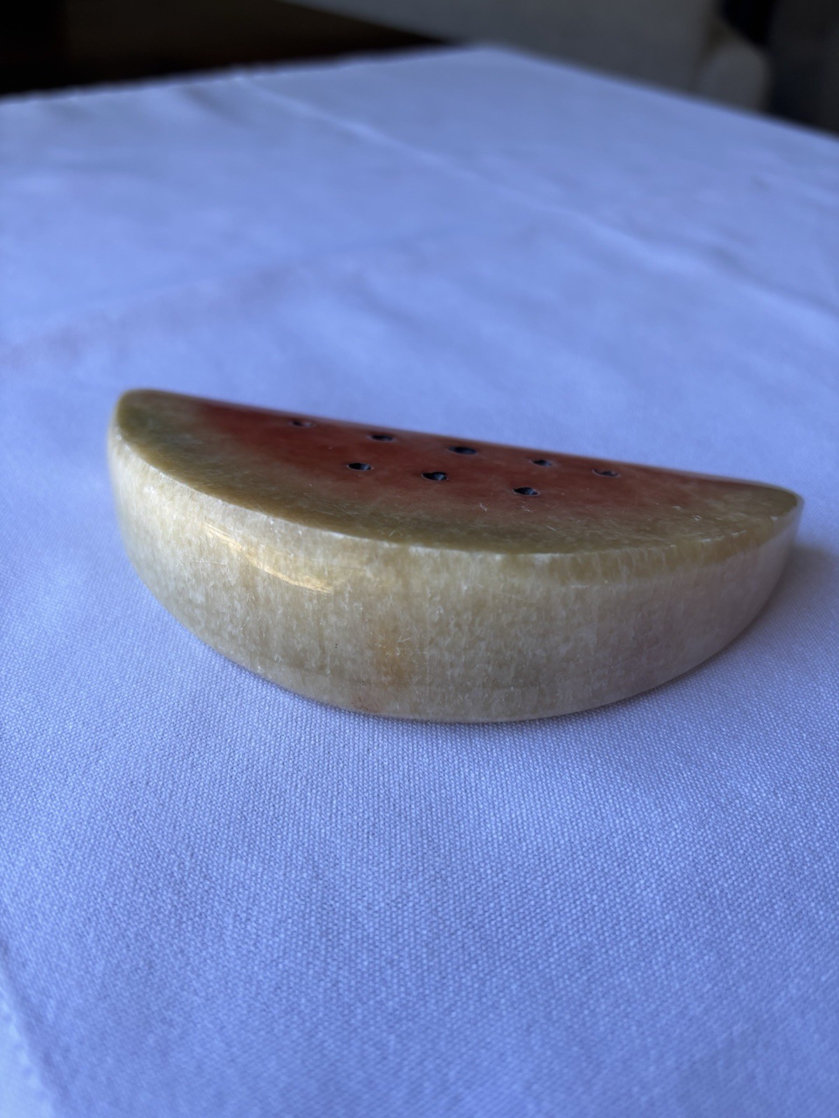 This Alabaster Marble Stone Watermelon Fruit Slice Paperweight is a vintage decorative collectible, hand-carved from marble or alabaster. The intricate design features a vibrant multicolor watermelon fruit slice, adding a touch of elegance to any space. This one-of-a-kind piece is perfect for collectors or those looking to enhance their home decor with a unique and eye-catching piece.