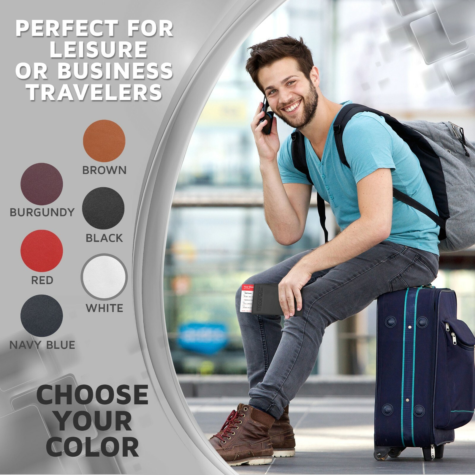 Slim BLACK Leather Passport Holder RFID Blocking Alban Brand with Pocket for Boarding Pass or Vaccination Card Record in Back Features: PROTECT YOUR PASSPORT at all times from wear and tear. Keep it safely stored inside sleeve even when not traveling. TRAVEL SAFELY RFID blocking material is built into the construction of the wallet to protect your personal information from being scanned. SLIM AND PRACTICAL Keep your travel documents together in this wallet without extra bulk. Boarding Pass and or Vaccination Card Holder fits in the slot at the back. DURABLE GENUINE LEATHER COVER for years of use. Your passport is one of your most important documents. If significantly damaged you may be ineligible for travel. PERFECT CASE for US and EU Passports. Fits a standard 28 or 52 page Passport book. WHAT IS RFID? It stands for Radio Frequency Identification. RFID chips are used in all US passports created after 2006 and in over 35 million credit cards. Using easily available technology, identity thieves can scan your personal information as you pass by, without you even realizing it. Our wallets block the standard frequencies for most credit cards and passports to protect you from this kind of electronic pick-pocketing. FAST SHIPPING, IN STOCK, IN USA.