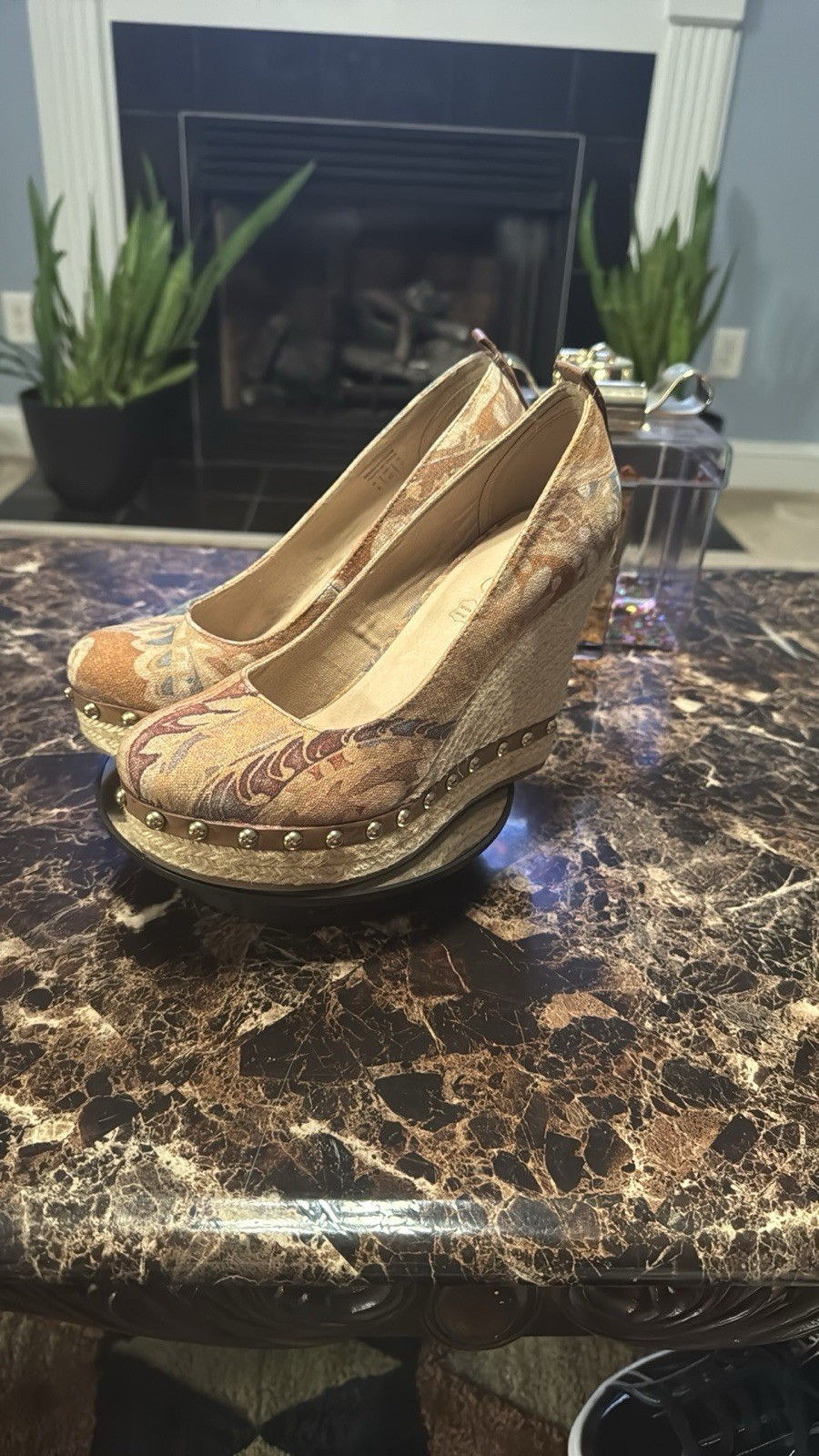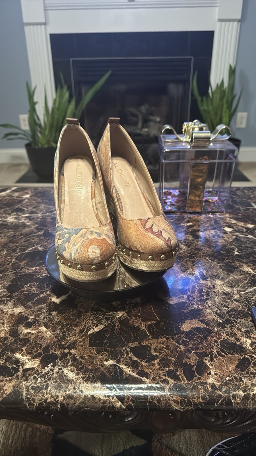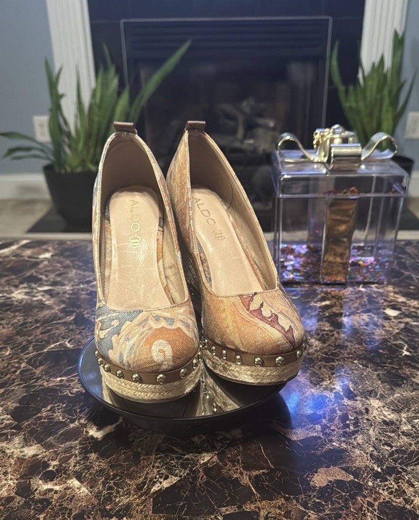 Step into style with Aldo's blue and tan wedges, featuring a chic floral pattern and a high cork wedge heel. The design and decorative accents add a touch of elegance, making them perfect for both casual and dressy occasions. The wedge heel style provides comfort and stability, making it perfect for any occasion.