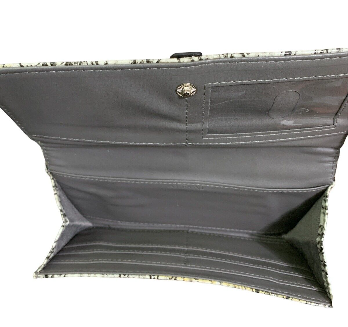 Alfani Bangle Organizer Large Wallet Snake Skin Print *glue along side seam of wallet. Alfani's Bangle Organizer is the perfect wallet that never goes out of style with its timeless shape and practical organizational features. 7-1/2"W x 4-1/4"H x 1"D; 0.25 lbs approx. weight Magnetic snap closure Silver-tone hardware, exterior zippered coin pocket Interior card slots, ID window & bill compartments Faux leather; lining: polyester Spot clean Imported