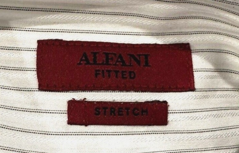 This shirt is so sharp it could cut through boring meetings. With its fitted cut and stretch fabric, it says "business" but feels like "couch." • Button-down front closure • Stretch fabric for comfort • Fitted design for a modern look • Long sleeves with buttoned cuffs • White with gray stripes for subtle flair No visible flaws noted. Top to bottom = 30 inches