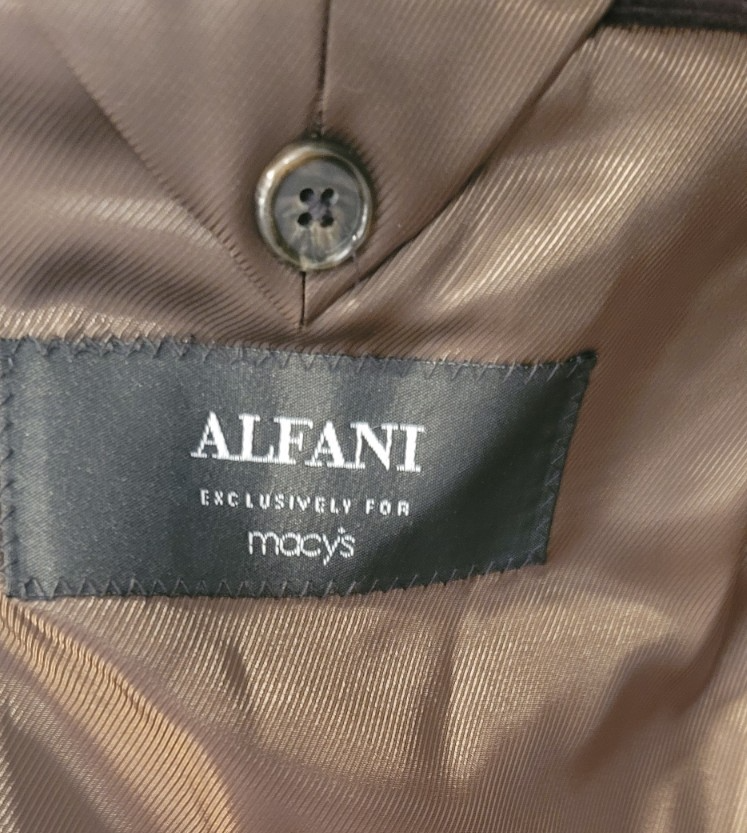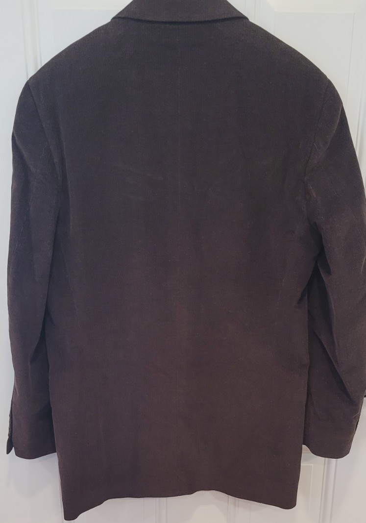 The Alfani for Macy's Men's Corduroy Sport Coat Blazer in Brown is a classic and stylish choice for various occasions such as travel, weddings, parties, casual wear, and business events. This sport coat features a shawl lapel, four-button sleeve, and a three-button front closure. Made from corduroy fabric with a luxurious silk lining, this blazer offers a comfortable and sophisticated look. With its timeless design and size 40L, this blazer is a versatile addition to any man's wardrobe. 25.5 inches sleeve length, 21 inches pit to pit (measure in the back) 33 inches from the bottom of the collar to the bottom of the jacket (measured in the back) 91% cotton, 9% silk 1 faux lapel pocket on the outside, 2 real pockets on the outside, 3 usable pockets on the inside padded shoulders, dry clean only, shawl lapel, single breast, three button Condition: pre-owned, excellent condition Keywords: wedding, dressy, work, meeting, date, Vegas, party, bachelor, sport coat, blazer, brown, professional, tailored, lined, pockets, cocktail party, contemporary, professional