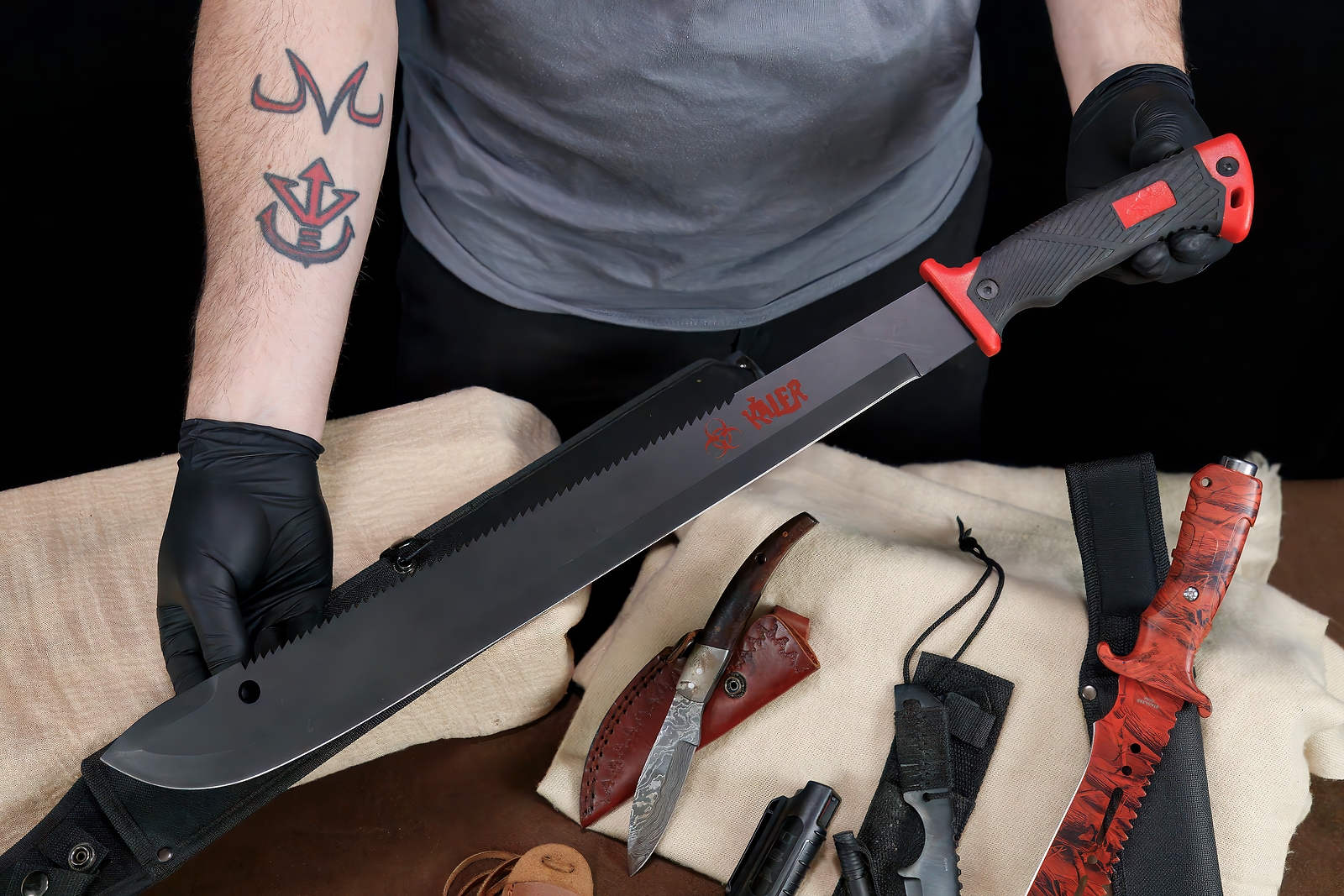 Specifications: Large Fixed Blade (Machete Style): Black handle with red accents Sturdy black nylon sheath with attachment loops/pockets Red & Black Serrated Knife: Red & black patterned handle serrated blade Includes black nylon sheath Pepper Spray: Compact black canister Clip-on for belt/pocket carry Mini Neck Knives (2): Small fixed blades Leather sheaths with lanyards Unique blade shapes and handle styles Knife with Fire Starter: Small black fixed blade Ferrocerium rod fire starter included Compact black sheath Paracord Bracelet: Orange and white weave pattern Durable with black plastic buckle Features: All-in-One Survival Kit: Knives, fire starter, pepper spray & paracord Machete-Style Fixed Blade for chopping and heavy-duty cutting Serrated Red/Black Knife with tactical grip & sheath Two Neck Knives lightweight & easy to carry Ferro Rod Fire Starter ignite campfires easily Paracord Bracelet woven for emergencies Compact Pepper Spray non-lethal personal defense Ideal for camping, bug-out bags, preppers, hunters & tactical collectors Description: This all-in-one Survival Knife & Tactical Gear Bundle is perfect for outdoor adventurers, preppers, collectors, or anyone building a bug-out bag. The set includes a large machete-style knife , a red and black fixed blade knife , pepper spray , two mini neck knives , a paracord survival bracelet , and a knife with ferro rod fire starter --a complete kit for defense, survival, and outdoor use. The heavy machete-style fixed blade features a black handle with red accents and a rugged nylon sheath with extra compartments. Complementing it is a red and black fixed blade knife with a partially serrated edge and a nylon sheath. For close defense, a clip-on pepper spray canister is included. Two miniature neck knives with leather sheaths and lanyards provide discreet backup tools, while the black fixed blade with ferro rod fire starter ensures you're ready to spark a flame in the wild. A paracord survival bracelet , woven in orange and white, completes the set for both function and style. Whether you're camping, hiking, hunting, or prepping, this bundle offers a versatile range of tactical tools in one value-packed lot.