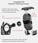 This 17mm (0.67'') ball handlebar clamp mount accommodates handlebars 0.5 inch (12mm) / 0.87 inch (22mm) / 1 inch (25.4mm) / 1.26 inch (32mm) in diameter. Tool-free design for easy installation or removal Package come with three soft rubber ring inserts to provide a snug fit and protection of the mounting surface. Rubber ring inserts diameter: 0.5''(12mm), 0.87''(22mm), 1''(25.4mm). You can add or remove rubber ring according to the diameter of handlebar. When the rubber ring insert is not embedded, the hole diameter of the handlebar mounting base is 1.26" (32mm) The handlebar ball mount utilizes rubber-insert and lock-bolt to prevent loosening in high vibration for mounting to motorcycle & bike handlebars and rear-view mirror as well as other round rails within the stated dimensions Main body made of 6061-T6 aluminum alloy for durability and reliability in the most demanding environments. CNC integral molding, solid structure. Anodized surface treatment, smooth surface, durable. TPU over-molded ball head, non-slip and wear-resistant This 17mm (0.67'') ball handlebar mounting base compatible with 17mm (0.67'') ball socket system. Not for 1 inch ball socket system. Works for bike motorcycle mount holder with 17mm swivel ball mounting pattern
