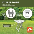 Product details The Aluminum Camping Table in Silver is a great choice for outdoor meals and gear setup. It is lightweight, rust-resistant, and easy to carry. The table folds in half for quick storage and includes a strong aluminum frame. It supports up to 110 pounds and weighs only 4.9 pounds. Use it for camping, tailgating, picnics, or backyard fun. Great for camping, picnics, tailgating, backyard, and more Lightweight and rust-resistant The camping folding table is made of aluminum Folds in half size for easy storage Weight of table: 4.9 lbs Dimensions: 19.29" L x 18.7" W x 24.6" H Weight capacity: 110 lbs Check out all the gear and enjoy the great outdoors