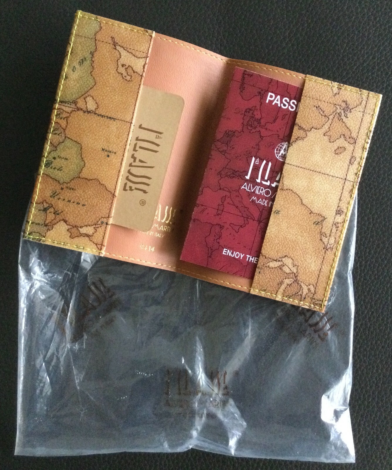 Alviero Martini Prima CLASSE Passport Holder European Map Model #9414 Italy Leather New - still in its original plastic cover - had to cut it open to be able to photograph the item. No tags. What makes this passport holder special is that the front of the holder has a real nice map on it much nicer than the one that I have kept for myself :-) The dimensions are 5.5" X 4.0" X 0.5" Shipping with USPS.