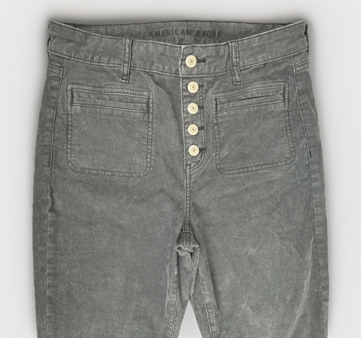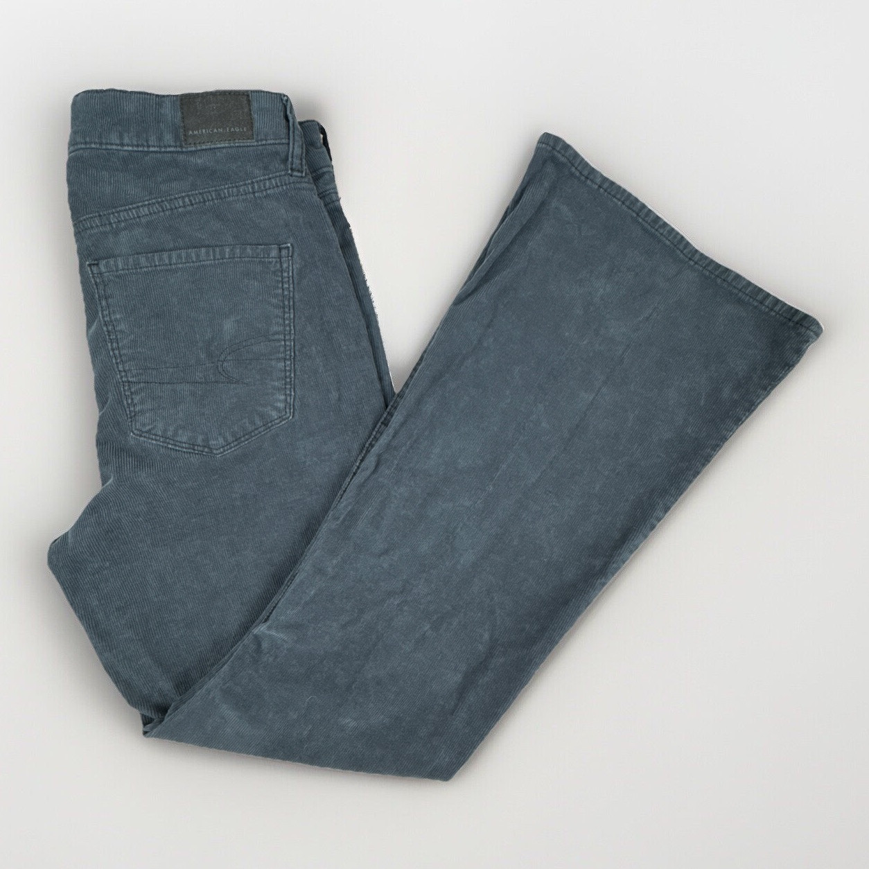 These American Eagle corduroy jeans in size 8 feature a solid gray color with a button closure and a high-rise fit. Made of spandex and cotton, they offer comfort and stretch. The flared style gives a bohemian, 90s, and preppy vibe, with easy care and pockets for added convenience. Ideal for winter, fall, and spring wear. please feel free to message with any questions or requests! Thank you - LMS