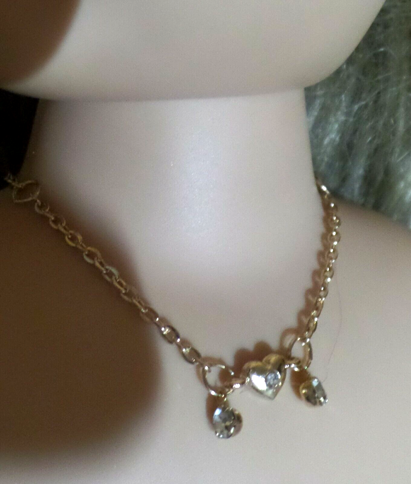 MADE TO FIT AMERICAN GIRL GOLD TONE RHINESTONES AND HEART JEWELRY NECKLESS MADE TO FIT AMERICAN GIRL AND SIMILAR AS WELL....NEW PLEASE LOOK AT ALL PHOTOS BEFORE PURCHASE...THIS ITEM IS DELICATE NOT FOR SMALL CHILDREN. NO RETURNS ..DISCOUNT SHIPPING IF MORE THEN ONE ORDER IS MADE AND SHIPPED TOGETHER...PUT IN CART FIRST BEFORE MAKING PAYMENT..MUST PLEASE ASK FOR NEW INVOICE BEFORE PAYING IN UPPER RIGHT CORNER OF CART DOES NOT INCLUDE DOLL OR SHOES HOMEMADE.. ...MORE TO COME BID WITH CONFIDENCE 100% FEED BACK.... NO RETURNS......PLEASE LOOK AT ALL PHOTOS AND DESCRIPTION PHOTOS ARE OF ACTUAL ITEM ON AUCTION.....I DO THE BEST I CAN TO GIVE YOU INFORMATION AND PHOTOS OF ALL ITEMS.... NO RETURNS IF YOU DON'T LIKE THE COLOR OR THE FIT....VERY GOOD ITEM...VERY WELL MADE...