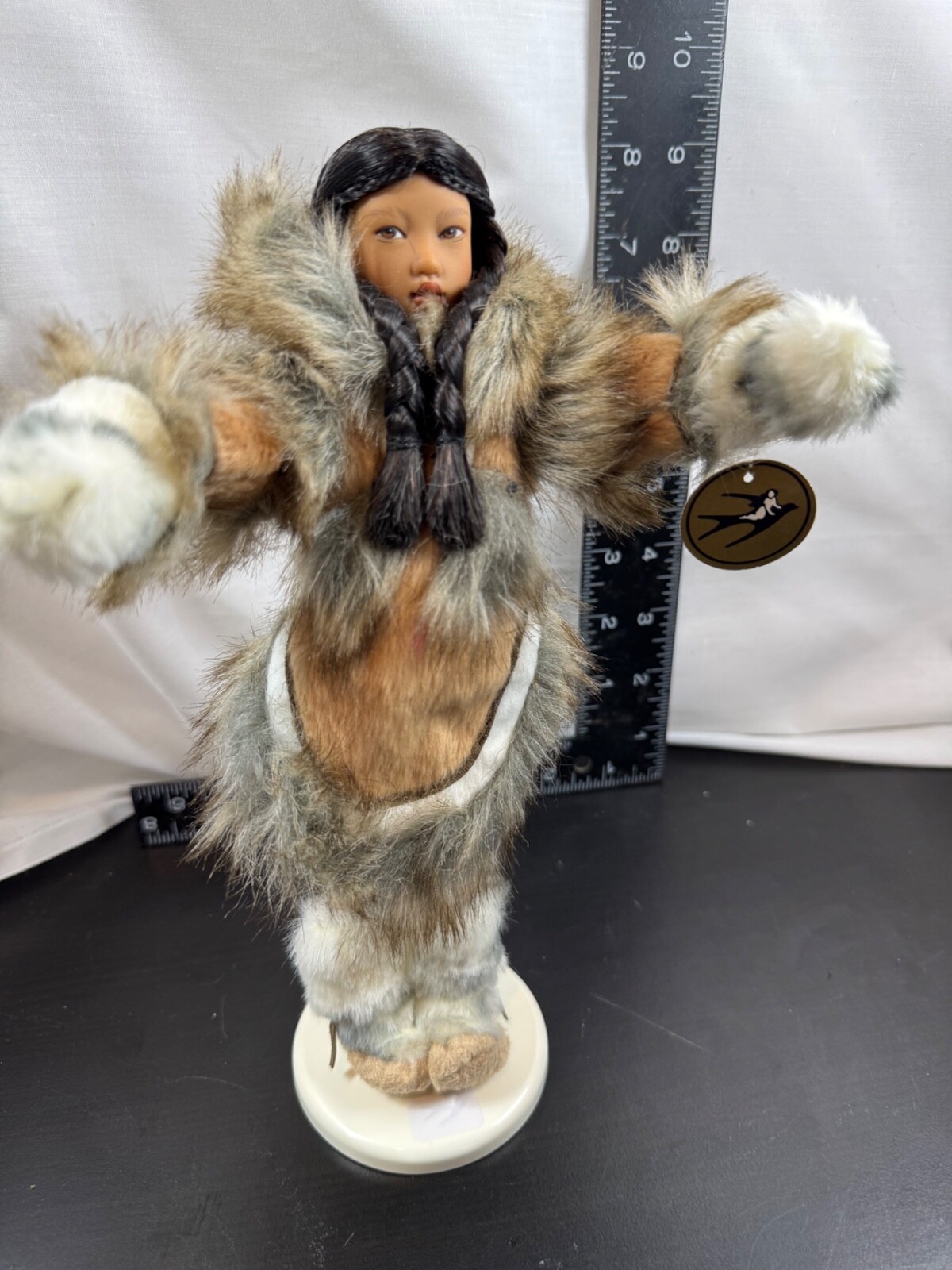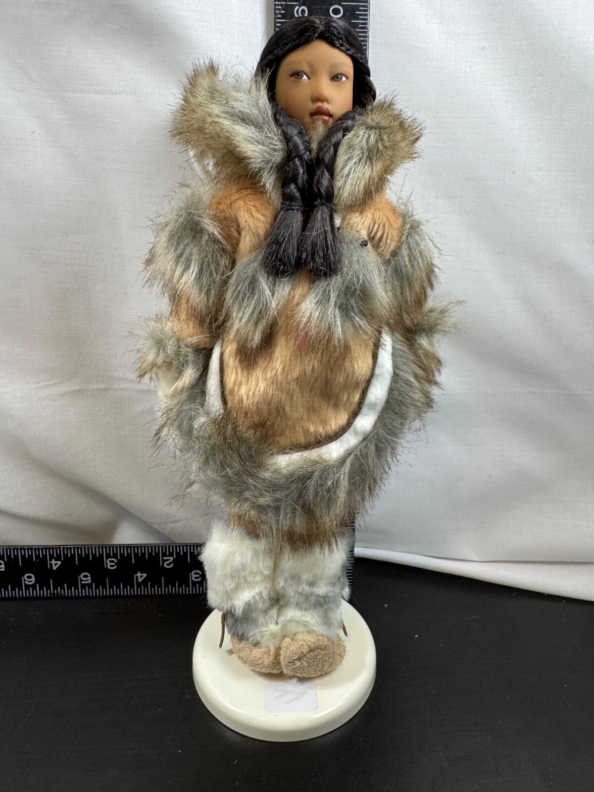 The American Girl Minuk Yup'ik Alaska Girls of Many Lands Eskimo 9" Doll with Stand is a collectible doll designed by artist Helen Kish in 2002. This doll features black hair with long braids, brown eyes, and a medium dark complexion, representing the Yup'ik character Minuk. Made of vinyl, bisque, and fabric materials, this original American Girl doll is part of the Girls of Many Lands franchise and is suitable for ages 10 and up. The doll comes with a stand and is a retired piece from 2005, making it a valuable addition to any doll collection. * Thanks for shopping with Becky