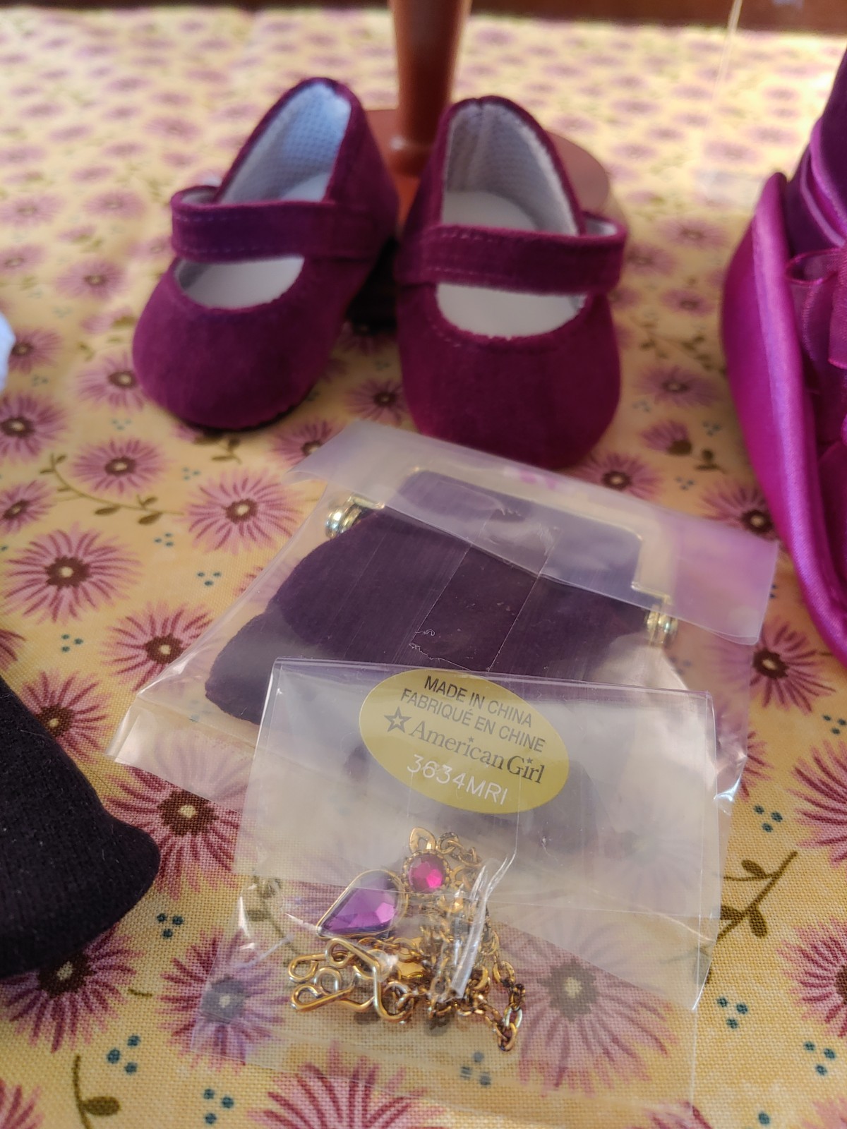 This beautiful AG Rebecca Rubin Outfit and all accessories were purchased with the original doll in which I used only the doll for my small company use to display my handmade doll clothing. The boxes and all the accessories have been stored away in a cool and dry area in my home. The outfit and Accessories include the lovely purple wool suit, bloomers, stockings, purple velvet shoes, a hat, velvet purse, necklace and book. Everything is completely in original packaging and some items were never opened. The original doll box and hat box are also included. Doll form not included.