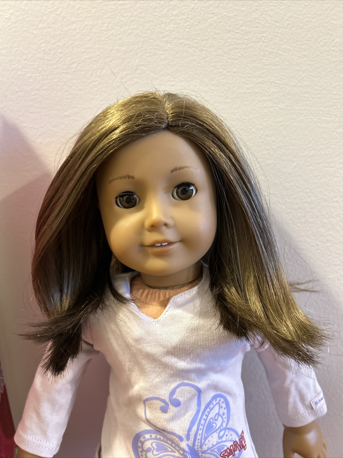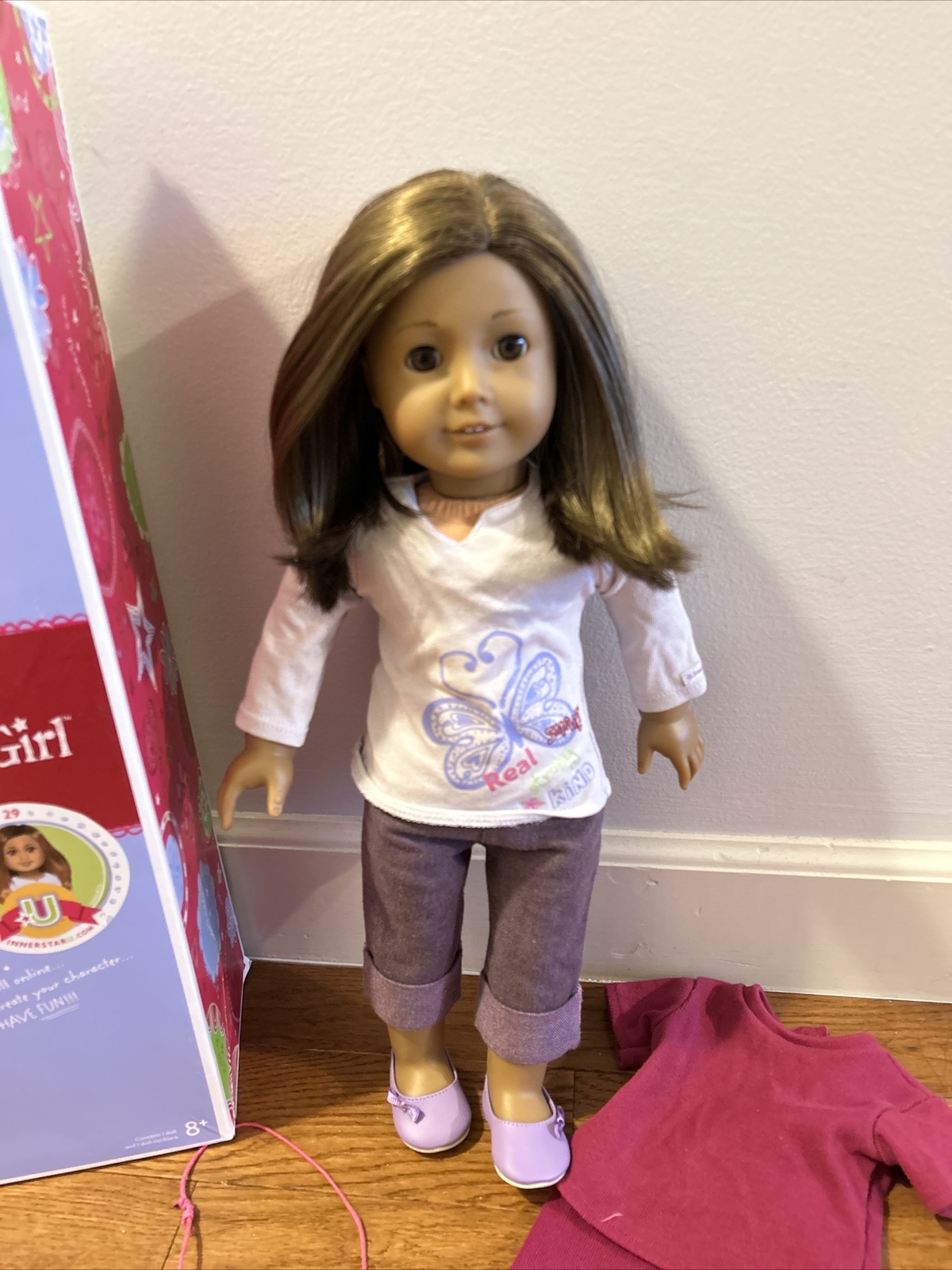 This American Girl doll, Truly Me #29, is a wonderful addition to any little girl's collection. With beautiful brown hair that falls straight and brown eyes that sparkle, she is sure to win hearts. This 18-inch doll is made of high-quality materials such as vinyl, cloth, and plastic, which make her a durable and long-lasting playmate. Her pajama set adds to the charm and allows for hours of imaginative play. This doll is an original and belongs to the Just Like You product line, making her unique and special. Don't miss out on the opportunity to bring home this wonderful play doll today! From a pet and smoke free home!