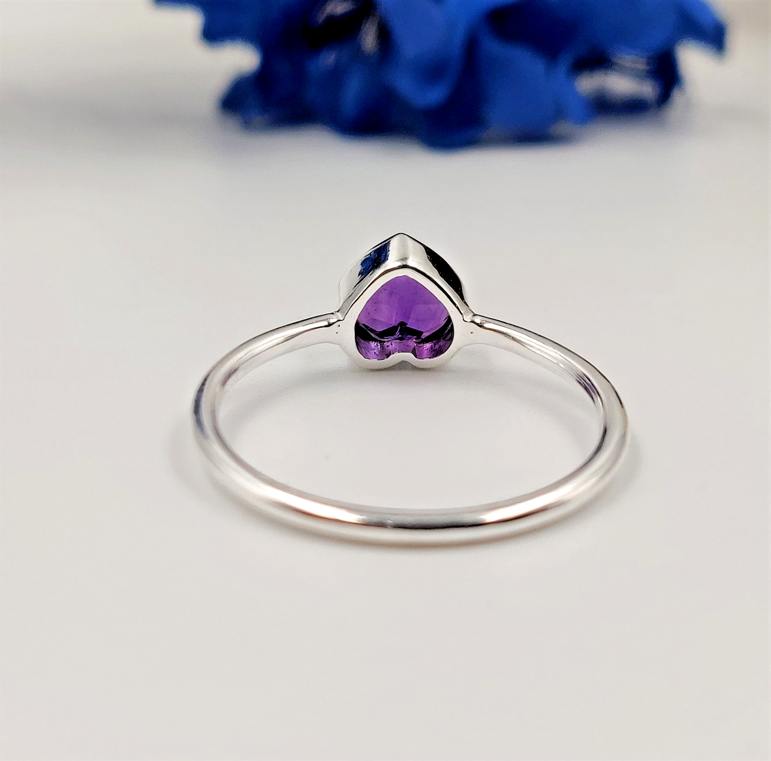 This amethyst engagement ring in heart shape is a stunning gift for women, crafted from 925 sterling silver. The minimalist band style with engraved details accents the purple amethyst stone, making it a beautiful choice for various occasions like engagements, anniversaries, or birthdays. Handmade in India, this vintage ring is customizable and comes with a seller warranty, ensuring high quality and unique beauty for the recipient.