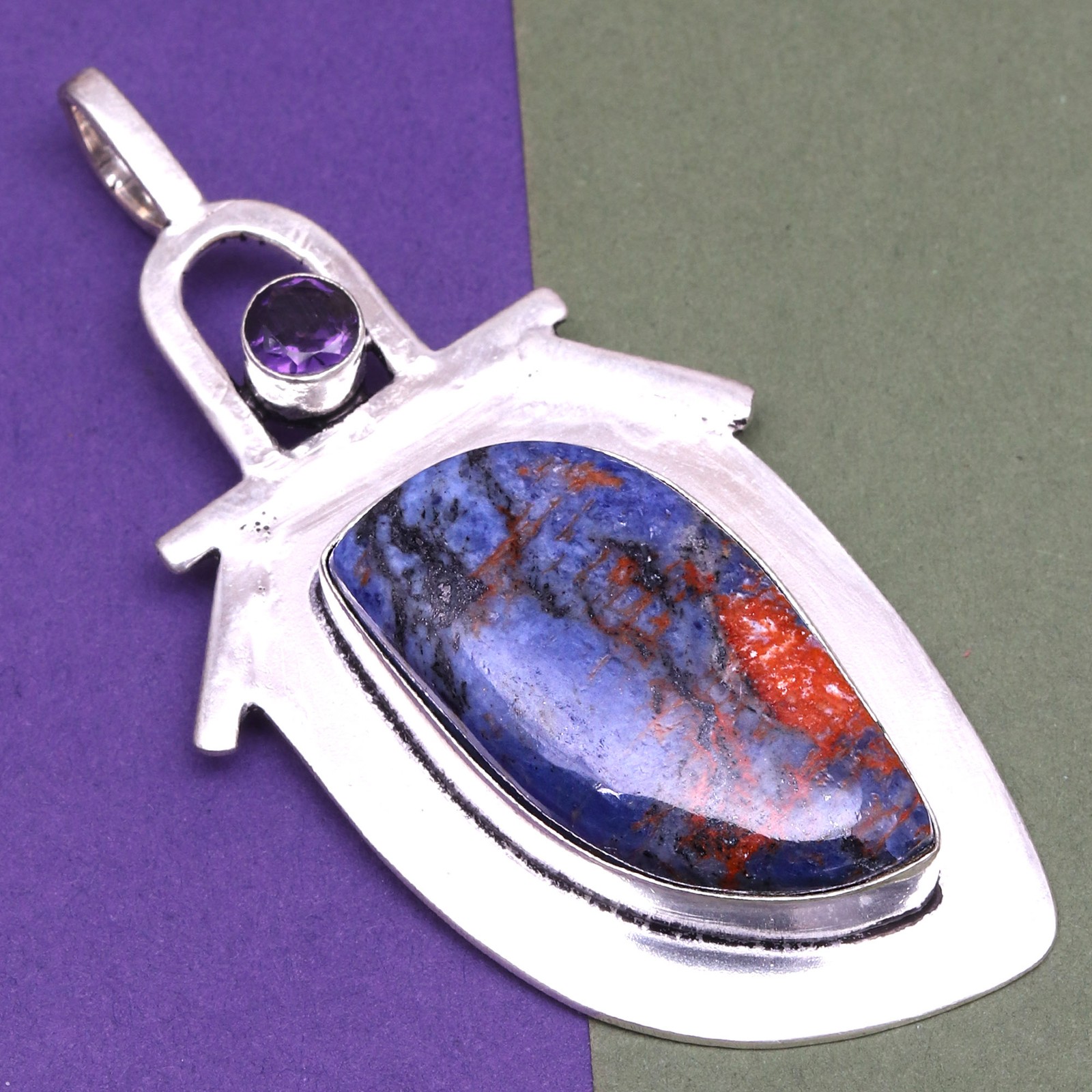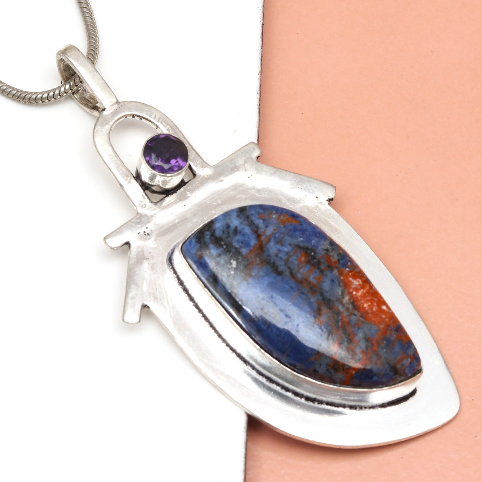 Closure: Hook Country/Region of Manufacture: India Main Stone Shape: Teardrop Era: Undated Metal Purity: Unknown Features: Adjustable, Engraved, Stackable Pendant/Locket Type: Charm Setting Style: Bezel Number of Gemstones: 2 Customised: No Vintage: No Color: Blue Chain Type: Snake Antique: Yes Wholesale: Yes Gemstone Clarity Grade: Eye Clean Brand: Unbranded Customized: No Metal: Silver Plated Style: Pendant, Locket, Chain, Tennis Main Stone Creation: Natural Occasion: Anniversary, Birthday, Christmas, Engagement, Mother's Day, Valentine's Day, Wedding Necklace Length: 20 in Theme: Beauty, Bohemian, Ethnic, Family & Friends Main Stone Width: 25.4 mm Main Stone: Sodalite Main Stone Colour: Blue UPC: does not apply Colour: Blue Main Stone Treatment: Not Enhanced Seller Warranty: No Main Stone Color: Blue gtin13: does not apply Cut Grade: Excellent Pendant Shape: Teardrop Type: Pendant Item Length: 3" Main Stone Depth: 8 mm Handmade: Yes Base Metal: Brass Secondary Stone: Amethyst Main Stone Length: 38.1 mm Material: Stone, Gemstone, Crystal, Cotton Country of Origin: India