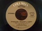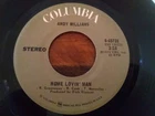 The product is a lot of three 7" vinyl records by artist Andy Williams, released in 1972 on the Columbia record label. The records are in Very Good Plus (VG+) condition and come in paper sleeves. The music style is 1960s Easy Listening. Each record plays at 45 RPM and is a single in the Easy Listening genre. Generic sleeves #146