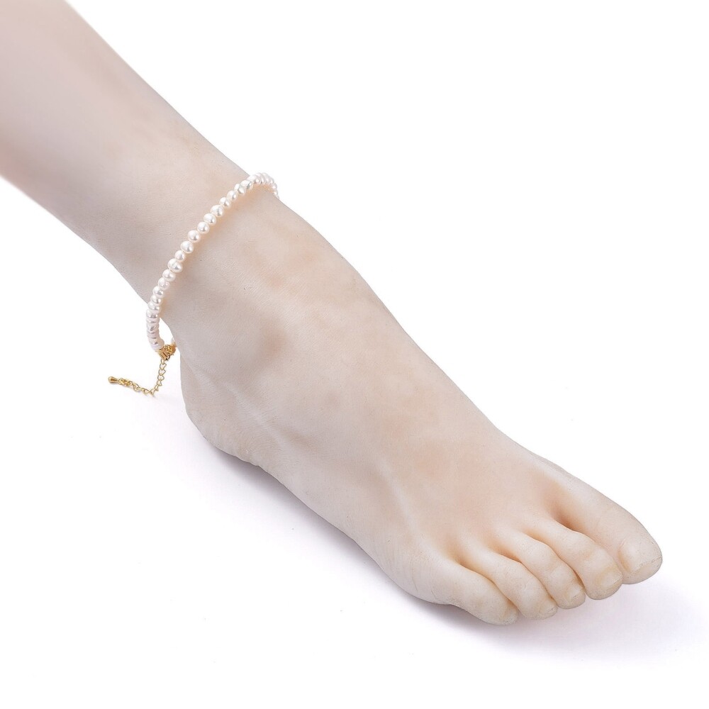 Size 91/2 inches(24cm) Material Pearl, 304 Stainless Steel Color Seashell Color Metal Color Golden Usage Anklets Package Size 1 Piece per package Description: Anklets, with Natural Pearl Beads, Brass Curb Chains and 304 Stainless Steel Lobster Claw Clasps, Seashell Color, Golden Size: about 91/2 inches(24cm) long, beads: 5~6x4~5mm, chain extender: 58mm.