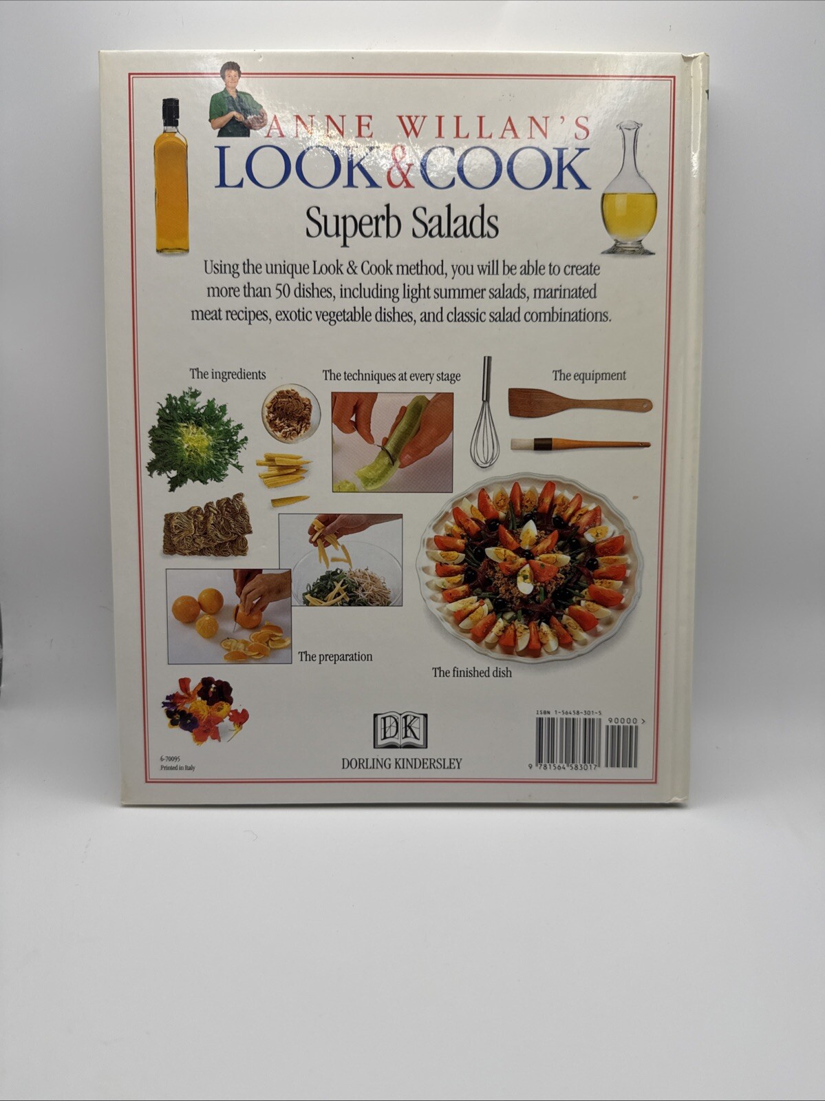 "Anne Willan's Look & Cook Superb Salads" is a first edition cookbook from 1993, featuring amazing salad recipes with colored photos and step-by-step guides. Written by Anne Willan, the book is intended for young adults and adults in North America. It includes 127 pages of main course salads, equipment, and ingredients, in a hardcover format with illustrations. Published by Dorling Kindersley Publishing, this cookbook is a must-have for salad lovers looking to create delicious dishes. Very good presentable collectible copy.
