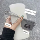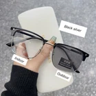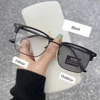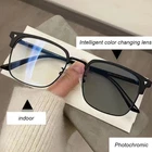 Package included: 1 Pc Anti-Blue Light Discoloration Glasses Specification: Type:Anti-Blue Light Discoloration Glasses Material:Metal Color:Black ,Black silver, Transparent Grey Style: photochromic ,Anti-blue Light,Ultra Lighth,Fashion Gender:Women, Men Feature: High quality anti-blue light discoloration glasses. The anti-blue light design can effectively block harmful blue light and protect the health of your eyes,especially when studying online courses. Intelligent color changing lens design, can change color with the strength of the sun, the stronger the sun, the deeper the color. Outdoor can be used as sunglasses, UV protection. Metal material,ultra-lighth,easy to carry,and comfortable to wear. Could be worn with everyday outfits or for formal dressing occasions. Light weight design, great for photography prop and decoration. Discoloration effect: Please soak in the sun for a while, then take off the sticker on the glasses and observe the discoloration effect. Anti Blue Light Glasses Man Photochromic