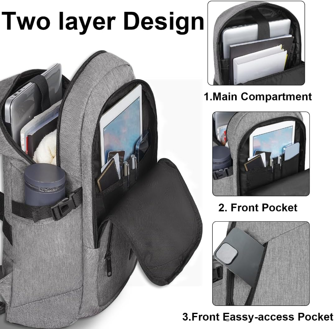 This backpack is a game-changer for travel and work! The anti-theft design gives peace of mind, and the USB charging port is super convenient. It fits my laptop snugly, has plenty of pockets, and the water-resistant material keeps my stuff safe. The grey color looks sleek and professional—perfect for business trips or daily commutes. Super comfortable to carry, even when packed full. Highly recommend!