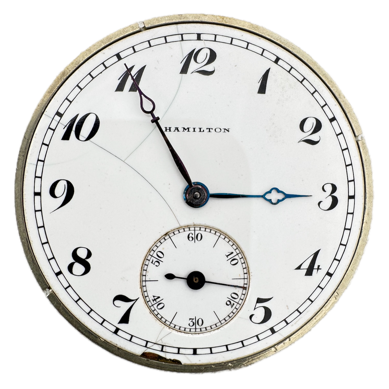Antique 10s 1920 Hamilton 23j Mechanical Pocket Watch Movement 920 USA Product Description Item: Pocket Watch Movement Brand: Hamilton Movement: Mechanical Production Year: 1920 Country: USA Jewels: 23j Gender: Men's Grade: 920 Size: 10s Product Measurements Diameter: 37mm Diameter of Dial: 41mm Product Condition Overall Condition: Fair, overall condition for its age. Functions: Running, but may be in need of service. This means, it can run unreliably, start or stop and timekeeping is not guaranteed. Dial: The dial has hairline crack(s) on it. Hands: There is discoloration on the hands.