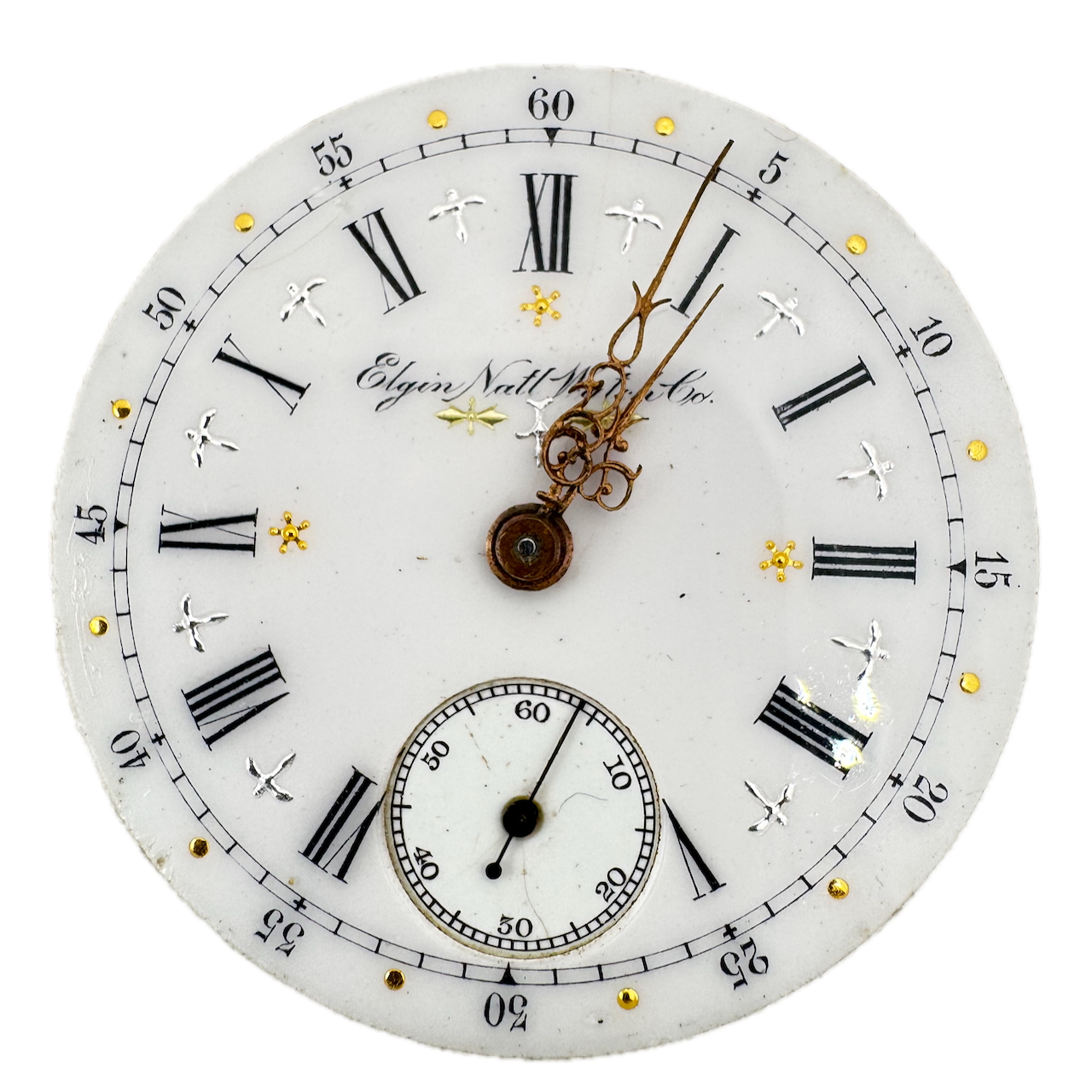 Antique 18s 1893 Elgin Multicolor 17 Jewel Pocket Watch Movement 123 USA Product Description Item: Pocket Watch Movement Brand: Elgin Model: Multicolor Production Year: 1893 Country: USA Jewels: 17 Jewel Gender: Men's Grade: 123 Size: 18s Product Measurements Diameter: 46mm Product Condition Overall Condition: Fair, overall condition for its age. Functions: Not running but the balance complete is in good condition. This item has not been fully inspected. Internal components may be damaged or missing. No guarantees are made regarding completeness or functionality of the movement. Dial: The dial has spotting.