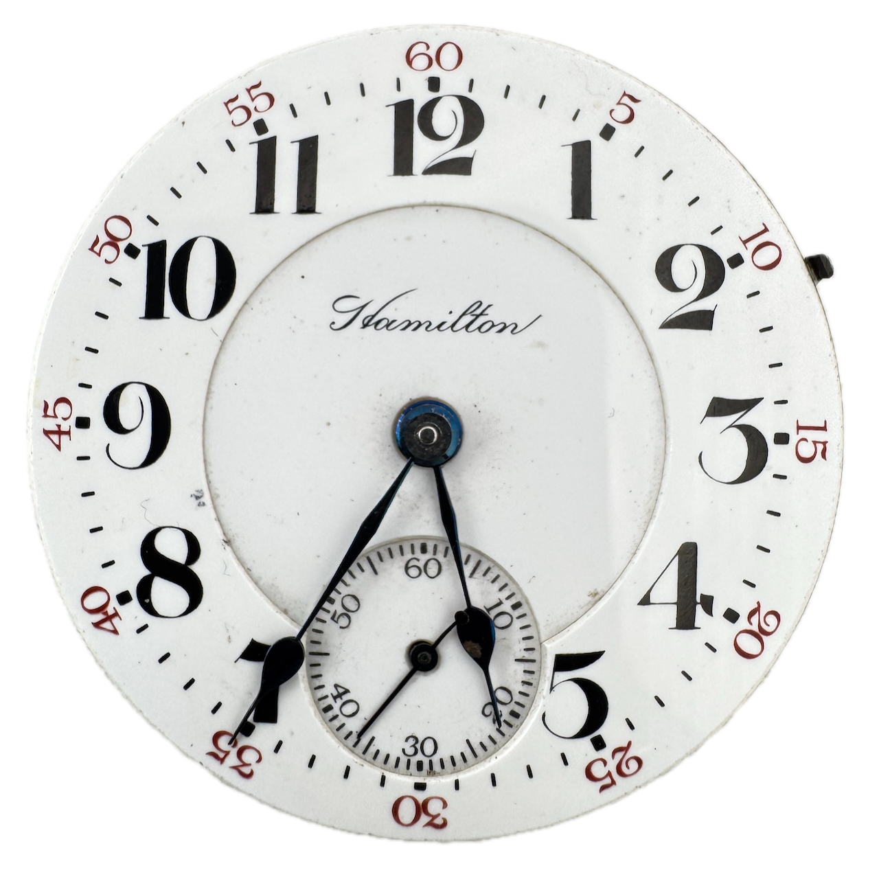 Antique 18s 1911 Hamilton 21J Mechanical Railroad Pocket Watch Movement 940 Runs Product Description Item: Pocket Watch Movement Brand: Hamilton Movement: Mechanical Production Year: 1911 Country: USA Jewels: 21J Gender: Men's Grade: 940 Size: 18s Product Measurements Diameter: 45.5mm Product Condition Overall Condition: Fair, overall condition for its age. Functions: Running, but may be in need of service. This means, it can run unreliably, start or stop and timekeeping is not guaranteed. Dial: The dial has discoloration. Crown: It is missing the stem. Hands: The hands have rust on them.