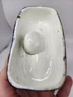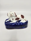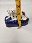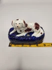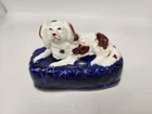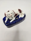 Victorian, circa 1860. 3.5 inches high, 4.8 inches wide, 3 inch depth. Staffordshire inkwell which features a spaniel, recumbent on a cobalt blue base. Spaniel is Russet and white. Dull gilt embellishment. Item is in excellent condition with no issues to note. There is some blue paint bleed from base to spaniels' paws which would've been done at creation. No cracks, chips, or crazing present.