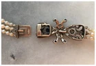 A unique antique Diamond and natural unheated blue Sapphire set claspon a triple row of Japanese Akoya Saltwater Pearls. Theclasp is 19th century and hand crafted from sterling silver with agold wash underside. The stylised Butterfly is unique in itsformation and has been set with natural white diamonds and a natural,untreated naturally mined blue Sapphire stone. The AkoyaSaltwater Pearls date from 1920s and recently restrung onhand-knotted silk. Natural diamonds - 1 x 4.2mm rounddiamond and 29 old mixed cut white diamonds. Natural Corundum(Deep Blue Sapphire), Round Mixed Cut, Transparent, Eye Clean, noevidence of heat treatment 4.27 x 3.36mm Pinctada Fucata(Akoya) Saltwater Cultured Pearls, round-near round, pink and greenovertones, very good lustre, 3.2mm - 8.2mm The clasp isunmarked sterling silver, tested. Length: 1.65 inches (4cm) Width: 20mm Necklace: Length (longeststrand): 19.5 inch (50 cm) Shortest strand length of pearls:17.3 inch (44cm) Shortest strand to end of clasp: 18.7 inch(48cm) Weight: 55.87g The Antique clasp is aged -the gold wash has mostly rubbed, there is a small break to thesterling silver with a small diamond deficit, unnoticeable when worndue to its location being surrounded by other diamonds. Please viewthe enlarged photographs of the area which is clearly visible on theright hand side. In addition to this, two diamonds are chipped,but still firm in settings, as are all the stones. If you have any questions, please let me know. NOTE: International delivery is DHL which is the only insurable option.