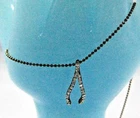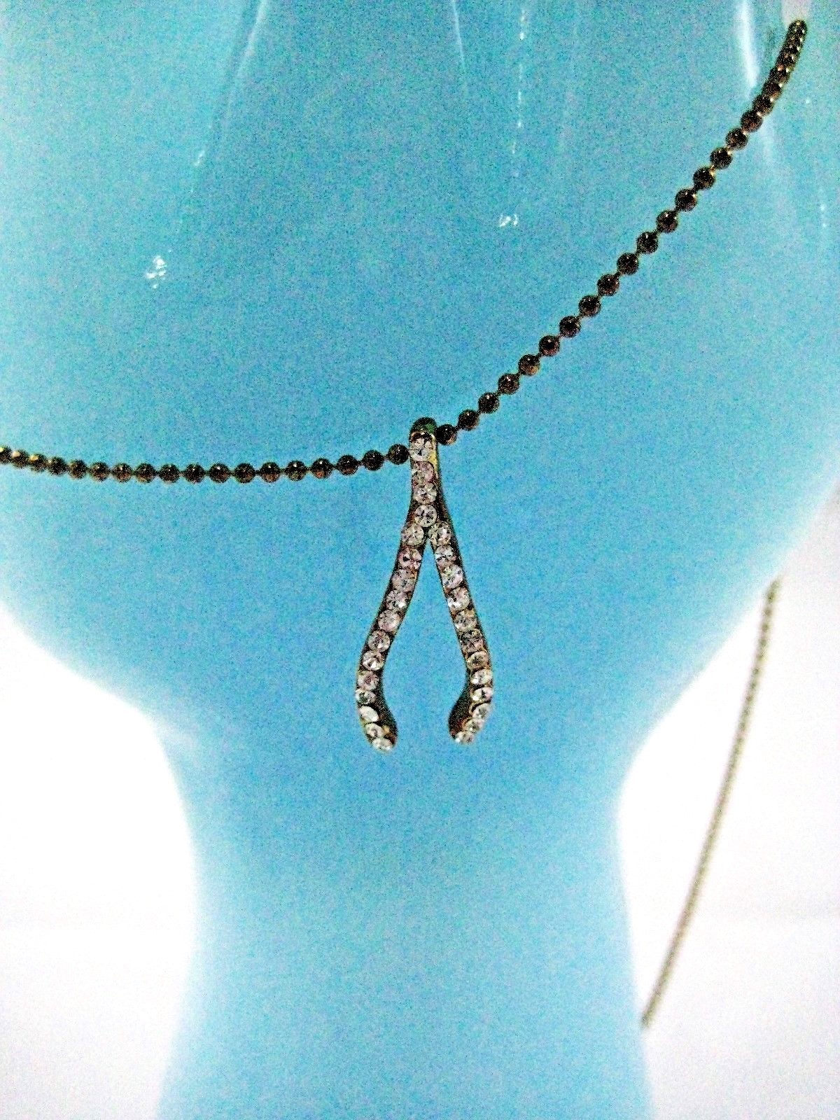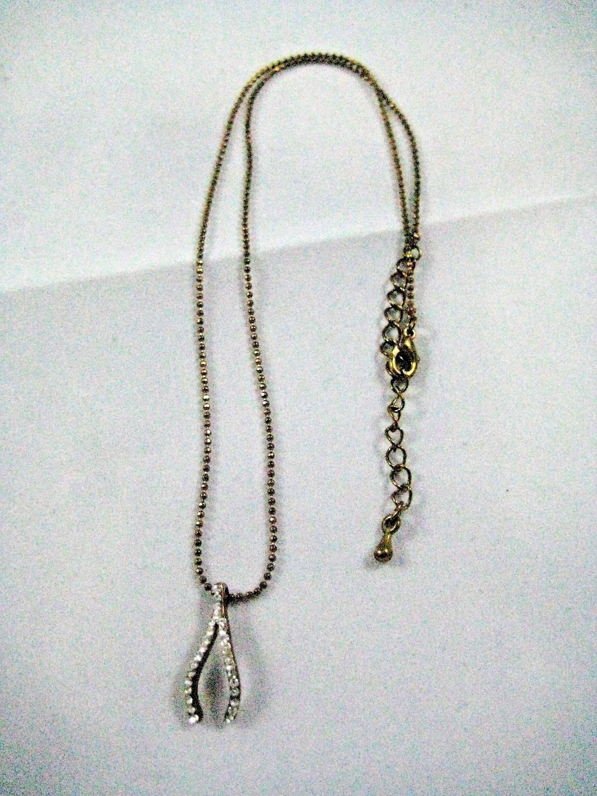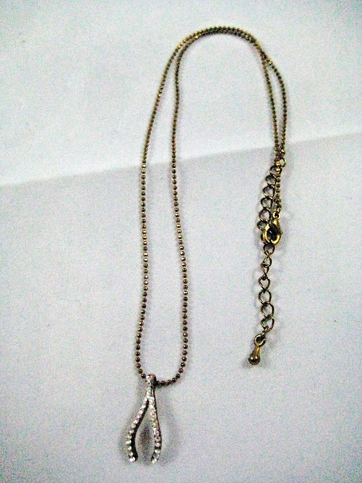 Necklace with curved wishbone charm studded with shiny clear rhinestones on front and antique bronze color on back. Matching shiny 1mm beaded metal antique bronze vintage look chain is adjustable from 15 3/4" up to 17 1/2" long and has teardrop hang tag and lobster claw clasp. A beautiful shiny necklace! In very good pre-owned condition. Shiny, clean, no damage. Shelf 01 Beige Tag Pink Drawer