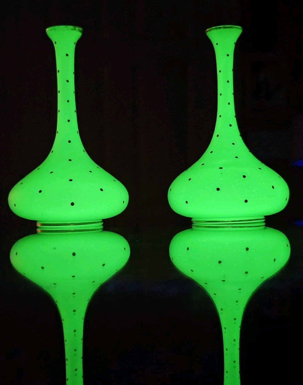 These are a gorgeous pair of early Victorian Jade opaline uranium glass gold gilt dotted patterns. They are in excellent condition with minor wear on the gold gilt around the top rim. There are no chips or cracks. They glow crazy under both 365nm and 395nm blacklights. There is a number on the bottom of each one. One has an 18, and the other has a 24. I have heard some people say they might be Baccarat. That would be good if they were, but if not, I think they are awesome. They have a great look, and I love that shape! If you have any questions, please ask.