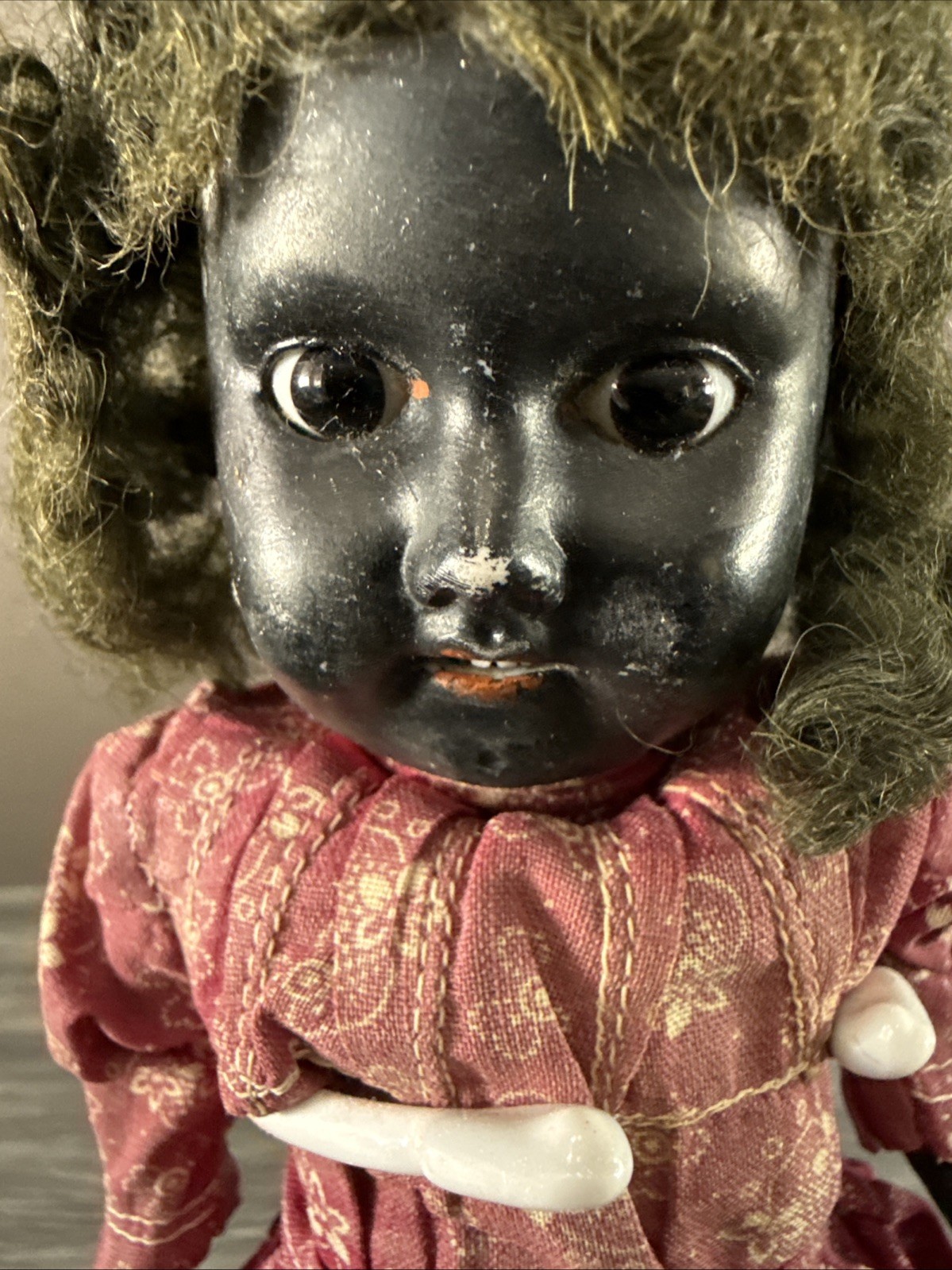 This antique German bisque doll features a 12-inch solid dome skin with a black doll design. The doll includes a wig and is made of bisque material, reflecting its age level of 17 years and up. With a pre-1900 time period manufactured and country of origin in Germany, this original girl doll showcases brown eyes and represents African American ethnicity. Perfect for collectors and enthusiasts of antique dolls, this piece is a unique addition to any doll collection. This is a rare rare rare doll. Paper mache body.