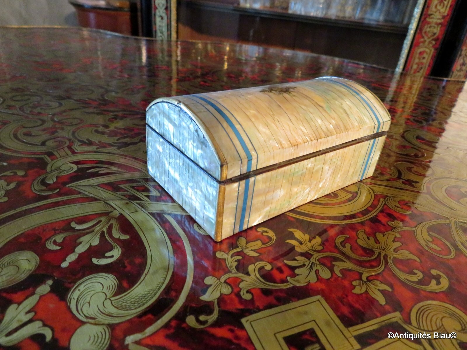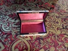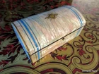 Jewelry Box marquetry exceptional Work very fine marquetry all sides perfect condition, on the top, a gold coin has been encrusted original interior in sycamore Dimensions: height: 3 cm width: 8.5 cm depth: 5.5 cm Jewelry Box in mother of pearl and turquoise Napoléon III period Perfect condition Interior in original silk Dimensions (in cm) : width: 12 cm depth: 7 cm height: 5 cm