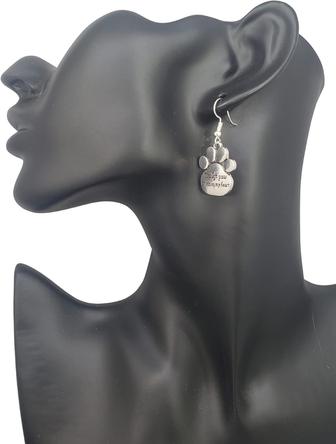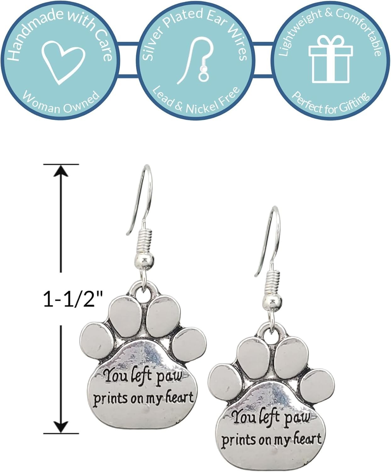 FOREVER FRIENDSHIP: These sentimental earrings feature a detailed paw print charm, a beautiful symbol of loyalty and the unconditional love shared with a furry companion. The heartfelt phrase, "You left paw prints on my heart," is engraved on the pad of the paw, making these a perfect and touching tribute to a beloved pet. ALL DAY WEAR: Designed with comfort in mind, these earrings are lightweight, allowing you to wear them from morning until night without any strain. PREMIUM MATERIALS: Theses earrings have a beautiful silver tone finish and are lead and nickel free, making them a safe and stylish choice for sensitive ears. SILVER PLATED EAR WIRES: They are made with silver plated ear wires that are both secure and gentle, perfect for those with metal sensitivities. PERFECT FOR GIFTING: Each piece is meticulously handmade with genuine care in Florida, USA, reflecting a dedication to quality craftsmanship. It arrives thoughtfully packaged in a lovely gift card, making it an ideal present for yourself or someone special who appreciates unique and beautiful accessories.