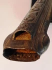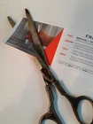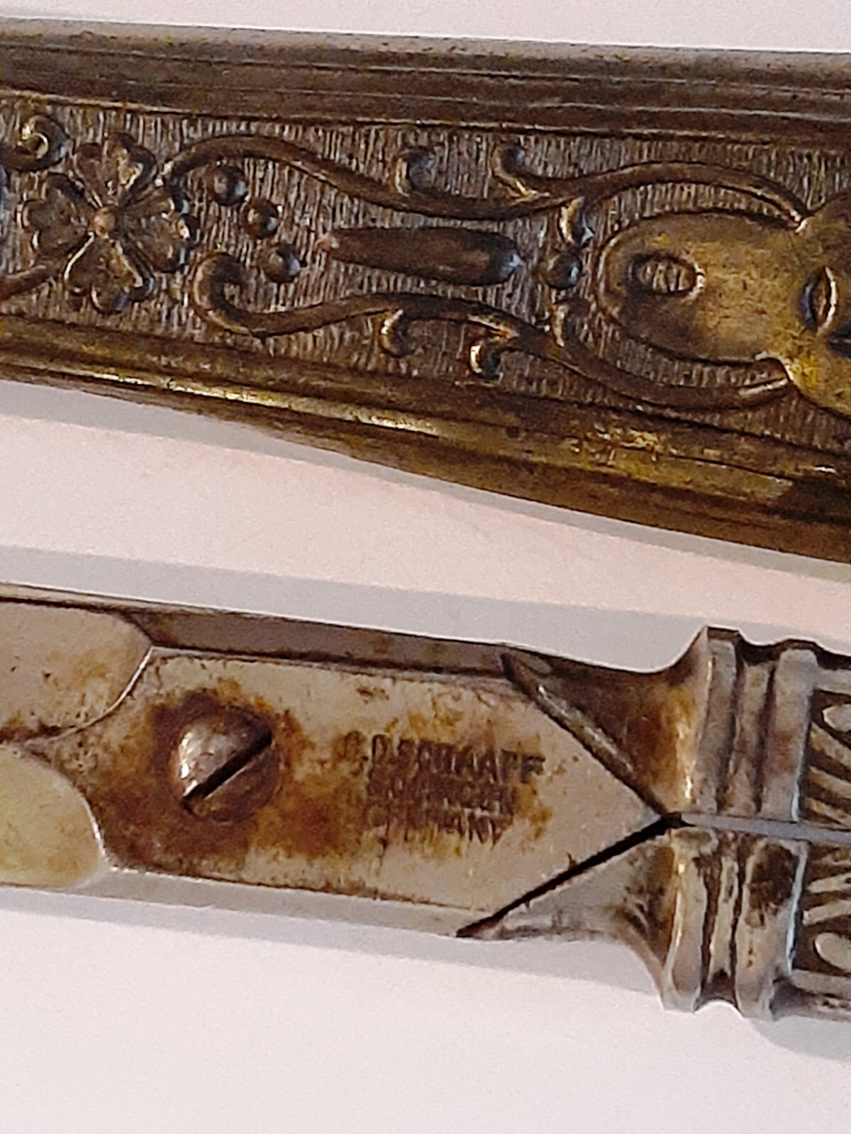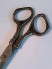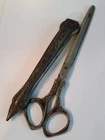 Ornate antique (19th Century) stainless steel scissors with brass sheath. The name is stamped on one wing and an outline of a gentleman smoking a pipe on the opposite side. The scissors are unhanded (for right or left usage) and are still quite sharp. The sheath has an additional pocket, presumably for an accompanying letter opener which is not included. In vintage condition with original patina. The set measures 9 3/4" long and weighs 141 grams.