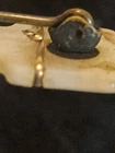 The Antique Victorian Carved Mother of Pearl Hand Clasp Brooch is a unique piece of vintage jewelry that features intricate carvings and a beautiful white mother of pearl design. The brooch is in the shape of a bar. This exquisite piece exudes elegance and charm, making it a perfect accessory for any formal occasion or to add a touch of vintage flair to a classic outfit.