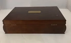This vintage wooden jewelry box comes with a brass name plate and a distressed finish, adding a touch of Americana style to your decor. The medium-sized rectangle box measures 12x9x4 inches and is lined with velvet, making it a perfect storage solution for all occasions. Distressed top has a small chip and many cracks on the wood. The brass plate is dulled with patina. See photos for more details