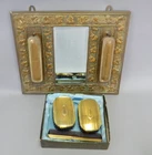Antique art nouveau mens brass hanging mirror clothes brush vanity set Victorian Ornate turn of the century hammered brass hanging mirror and brush set plus a box set of brushes with comb probably from the 1930's or so. Frame is about 15" x 12". Brush set in original box??, comb is marked 'S&B bronze'. Thanks for looking Payment: Please be aware that the Internet is no longer tax-free and eBay may collect sales tax on behalf of your state or country. Curiosity Consignment: 7860 Beechcraft Ave, Gaithersburg MD 20879 Shipping: Combined shipping is done at the sellers discretion. Similar items won that can be safely packaged in the same box will reduce the total estimated cost. Just wait for your invoice. Shipping charges keep increasing and while we are happy to provide free expert packing labor, we can't help the cost of shipping. Domestic items shipped will be left without signature if the value is below $200. For items valued over $200 or if the address appears to be an apartment, signatures are required for delivery. International buyers, please be aware that you may have to pay import tax or customs fees upon delivery. We do not misrepresent the purchase price of items on packing slips. Winning bidder is responsible for actual shipping charges. About Us: Curiosity Consignment is your professional downsizing partner and eBay trading post serving the metro areas of Baltimore and Washington DC. As a full service estate liquidation company, allow us to relieve you the burden of downsizing or sorting and selling large personal collections or even the personal estate property of a friend or loved one. We specialize in home clean-out jobs and can often leverage the value of the contents of a house versus the labor to pack and empty the contents. As a small family business, we identify with the Christian faith and share the message of John 3:16 and wish hope and peace to everyone. Thanks for reading! Legal: Curiosity Consignment does not own most of the items being sold, but is merely a bailee acting on behalf of the seller to facilitate the sale of the goods by holding the goods until such time as a sale is completed and the goods are shipped to the buyer. Curiosity Consignment has used its best efforts to inspect the item(s) for sale and create descriptions and furnish photographs that fairly and adequately depict the type, condition and image of the goods at the time of sale. Curiosity Consignment makes no express or implied warranties or representations regarding the condition or suitability of the goods and to the extent allowed by law, specifically disclaims any express or implied warranties, including but not limited to any warranty of merchantability or fitness for purpose. Curiosity Consignment reserves the right to cancel bids or end an auction up to 24 hours before a given auction is scheduled to end. Powered by CrossPostit