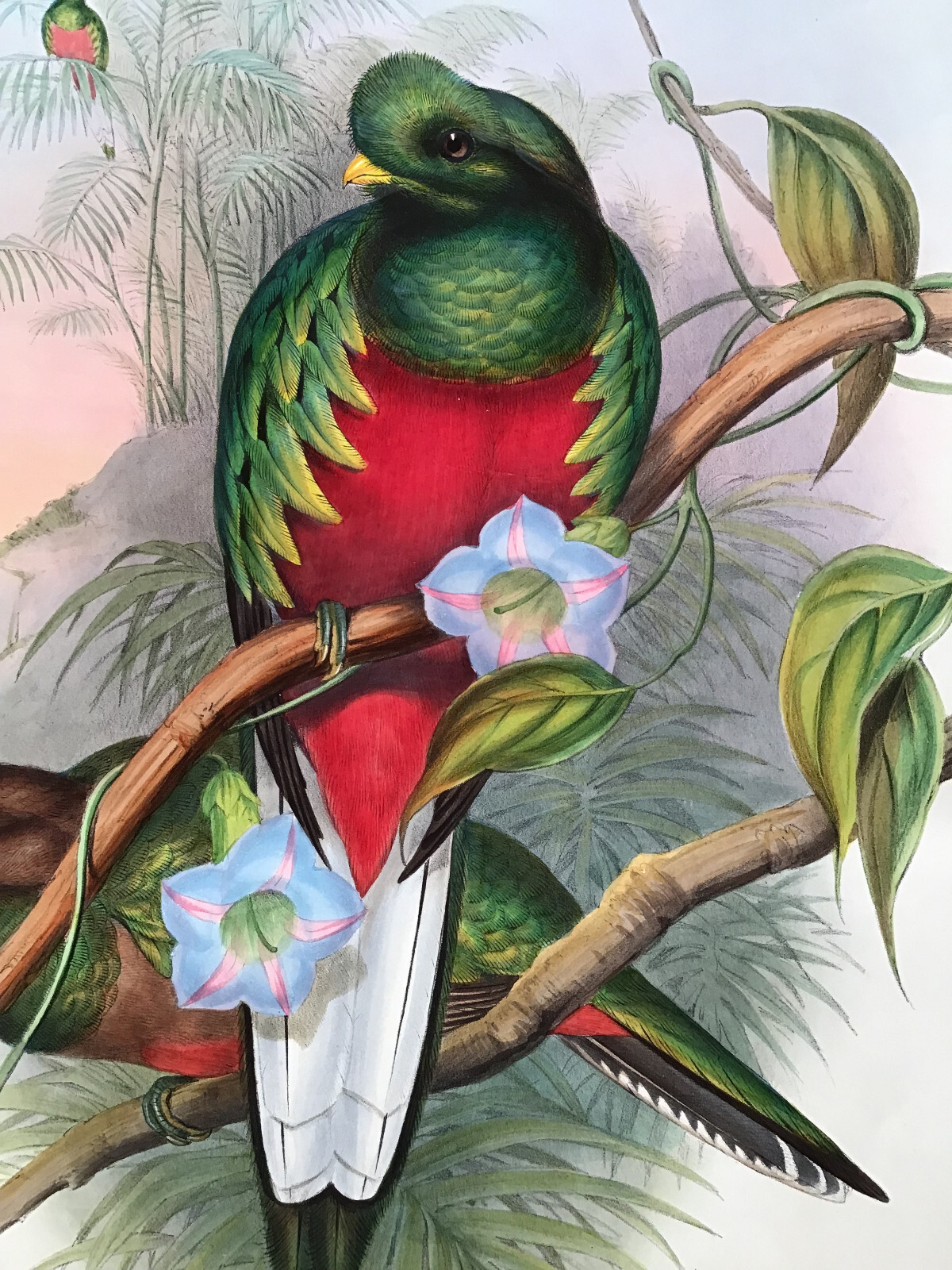 Antique hand-colored bird print of Elegant Trogans by john Gould