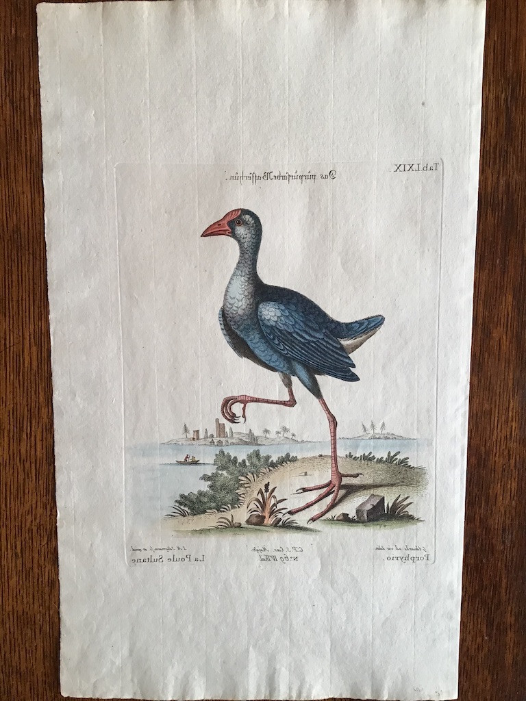 Antique Hand-colored Bird Print of Englishmen George Edwards Edwards’ early hand-colored prints are among our favorite bird illustrations. His major work, published in London (with a title too long to quote), 1741 to 1764, contains prints of mammals, fish, reptiles, insects as well as of birds from many parts of the world. His birds are more life-like than illustrations that preceded him, and his lovely renderings of abbreviated natural settings, including rich foliage, are charming. Many 18 th and early 19 th century bird prints are quite small and don’t show up terribly well on some walls; not so with the larger prints of George Edwards. In his Fine Bird Books 1700- 1900, author Sacheverell Sitwell writes of Edwards: “At its date of issue the Natural History and Gleanings was one of the most important of all Bird Books, both as a Fine Bird Book and a work of Ornithology. It is still high on each list.” We had to look long and hard over many years to acquire prints 150 or more years old that are still in excellent condition, as these treasures are. Be careful elsewhere -- there are photo repros out there that can fool, even some the correct sizes for 18 th century Edward prints. They’re worth almost nothing. Purple Swamphen of Eurasia with amusing scene of two persons in a boat beyond. In superb condition, no flaws; ca. 10 ¼” w x 17 ¼” tall; numbered “No 69.” Most Edwards prints made in England are on shorter paper (ca. 9 1/4 “ w x 12” tall). A very few, as here, were printed from the same copper plates but on much larger paper (ca. 11.5” w x 19” tall), and some believe these were more carefully hand-colored. They may certainly be trimmed for framing, but we recommend leaving them at least somewhat longer than the regulars to indicate their rarity. $170
