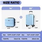【Packing Includes】2-piece luggage sets includes 14inch Cosmetic Case(12.79 x 6.49 x 11.22) and 20inch Carry On Luggage(14.6 x 8.46 x 22.6).The golden ratio composite material of ABS+PC is approved to have the coexistence of firmness and flexibility. 【Portable Cosmetic Case】The suitcase is divided into two separate compartments with nets and crossed straps to prevent luggage from shifting and to make the most of the storage space.The Cosmetic Case has a black elasticated strap on the back to secure it to the luggage handle, freeing up your hands for more convenient travelling. 【TSA Customs Lock】 TSA Customs zipper lock, sturdy and reliable, gives you more peace of mind.When going through customs, you don't have to worry about the box lock being damaged due to brute force detection. (TSA locks do not come with keys) 【Suitcase with 4 wheels】Travelling suitcase with 4 Spinner wheels can be easily moved anywhere, anytime, with good stability and quiet operation.The wheels are fully mobile and do not deform in any way when rolling. 【Reliable Warranty】 We provide a ten-year warranty, you can always contact our after-sales team, we will actively solve the problem for you to your satisfaction.