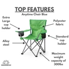 The Anytime Chair is the perfect folding chair for every event. Great for camping, sporting events, backyards, concerts and more, our comfortable and durable camping chair has 2 mesh cup holders, durable fabric, and a strong frame. The powder-coated steel frame and durable seating holds up to 300 lbs, and includes a carry bag with strap for easy transport and storage. Sit back and relax with one extra large cup holder for large beverages or gadgets and one standard cup holder for your smaller beverages. Never stop the adventure. At , we share your passion. It's why we design and build the finest camping accessories and outdoor gear. Our products are manufactured to meet the highest performance, comfort, and durability you expect. Want to make the most out of every time you explore or rediscover your favorite spot? You've come to the right place. Foldable & Portable: Great for camping, sporting events, backyards, concerts and more, the comfortable Anytime chair has 2 mesh cup holders, durable fabric, and a strong frame. Perfect for Every Event: Our camping chairs for adults feature one extra-large cup holder for large beverages or gadgets and one standard cup holder for your smaller beverages, so you can sit back and enjoy any event. Durable Camping Chair: Get maximum comfort and durability. The frame is made from 19mm powder-coated steel with strong, polyester fabric to hold up to 300 lbs. The polyethylene coating makes it stand up to any weather. Made for On the Go Fun: Our folding chair can be used as camping chairs, patio chairs, stadium seats, a beach chair, and so much more. Includes a carry bag with strap for ease of transport and storage. Dimensions: 35 x 34.5 x 21 in. Never Stop the Adventure: At , we provide premium camping accessories and outdoor gear. Our products are manufactured to meet the highest performance, comfort, and durability you expect.