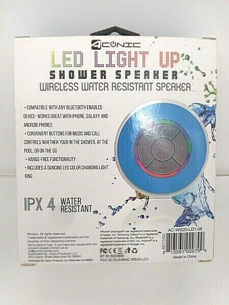Aonic Shower Speaker Wireless Bluetooth Water Resistant Blue LED Light Up NEW Please Read The Return Policy,Descriptions And 1 Day Handling Times Carefully Before Purchasing *** ATTENTION !!! My Best Offer Is Set At $3.00 To $10.00 Less Than The Fixed Price *** *** All Photo's Are Of The ACTUAL Item(S) That You Will Receive Guaranteed *** *** Ships From The U.S *** (1 Or Same Day Handling Time ) **PLEASE READ!! *** Saturday-Cut Off Handling Time Is 7 Pm Eastern Standard Time(Will Ship On Monday) Sunday - Cut Off Handling Time Is 7 PM Eastern Standard Time(Will Ship Next Day On Monday) Mon.-Fri. - Cut Off Handling Time Is 1 PM Eastern Standard Time(If Ordered After 1 PM Will Ship Next Day) *** If Order On A Major Holiday We Will Ship The Day When The Post Office Reopens *** *** Ships USPS Priority Mail Package Delivery (Reg.Box 6x6x6) *** (U.S) *** Ships Ebay International Standard Delivery (Reg.Box 6x6x6) *** ( International ) Item Description : Compatible With Any Bluetooth Enabled Device Works Great With iPhone,Galaxy And Android Phones .. Convenient Buttons For Music And Call Controls Whether Your In The Shower,At The Pool,Or On the Go *Hands-Free Functionality *Includes A Dancing LED Color Changing Light Ring Stream From Bluetooth Enabled Devices Built In Mic To Answer/End Calls **Be Sure To Inspect Your Item Immediately Upon Arrival Please Leave Positive Feedback If You Are Happy And Satisfied With your Purchase If By Any Chance That The Item Is Not As Described Please Contact Us So That We Can Fix It...Please Report The ERROR To Us. Condition- *** New *** *Location : From A Smoke Free And Pet Free Home ! *Payment : ALL TRANSACTIONS MUST BE HANDLED THROUGH EBAY ONLY!! *Shipping : We Ship All Items 1 Or Same Business Day Of Payments Clearing (Including Weekends And Holidays) We Ship Worldwide * Return Policy:Please Read Carefully !! *** If We Offer Returns *** We accept a return for any reason during 30 days after receiving the item Undamaged,in resalable condition and original package for a refund less ALL shipping costs plus restocking fee 10%. Items That are Broken,Taken Apart,Scratched from a smoking environment will not get a refund. Please be gentle with the item. We Provide you with Descriptions; If you need more information about the item ..Please don't hesitate to ASK ! We will be more than happy to help you to make the right purchase. HAPPY AND SATISFIED CUSTOMERS ARE OUR # 1 PRIORITY !!! ***** Contact Us ****** Please Feel Free to Contact us with Any Questions about the Item Thank You For Stopping By and Have a Great Day!!