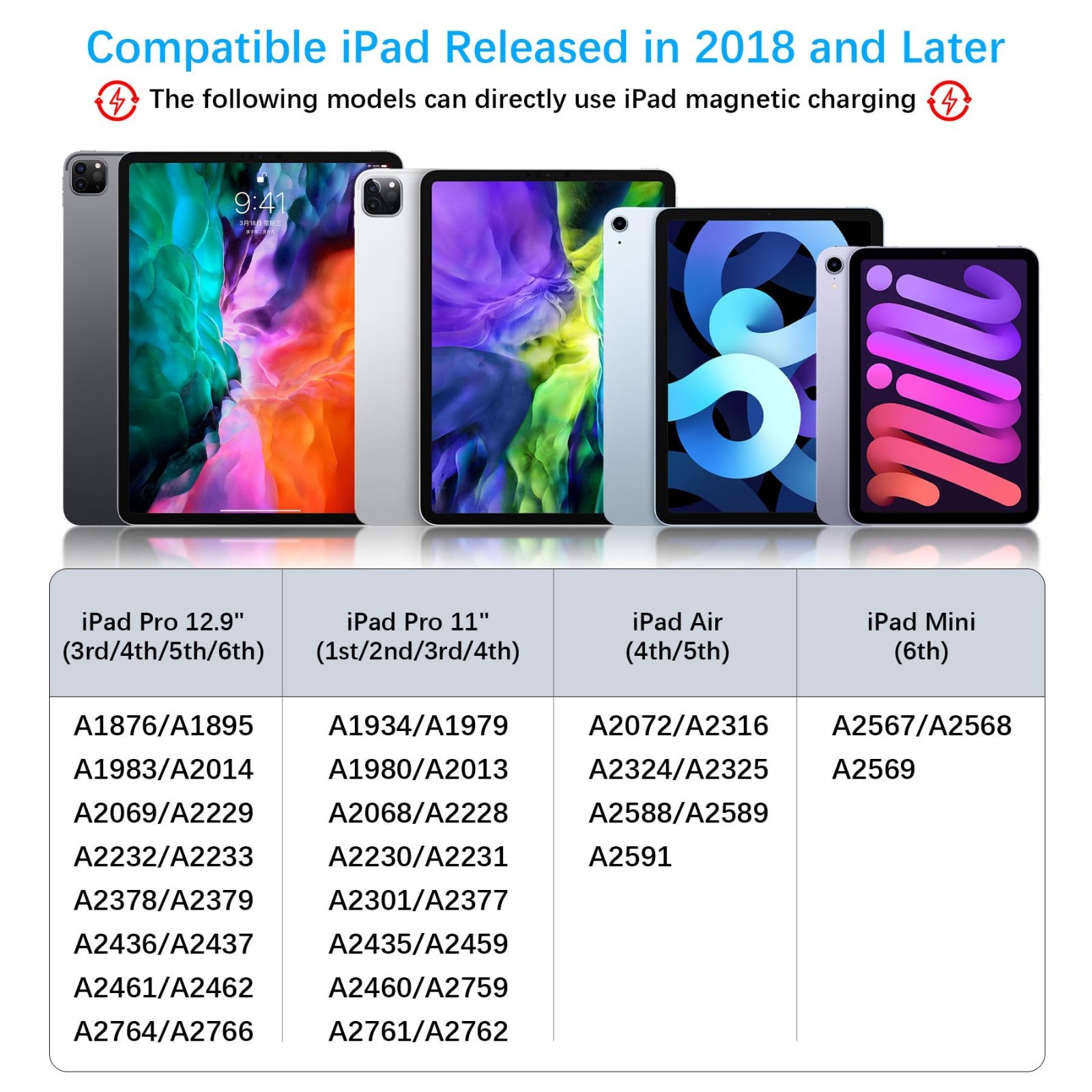 iPad Pencil 2nd Generation, Apple iPad Air/iPad Mini/iPad Pro Wireless Charging Product Description Magnetic Charging: This stylus pen is equipped with magnetic charging capability, it can be directly charged using magnetic charging on most iPad models from 2018 to the latest. However, there are a small number of iPad models from 2018 to the latest that do not support magnetic charging, for those models, you will need to use our magnetic charger for charging. Please refer to our compatibility chart for more details. Quick-Start: When you attach this stylus to an iPad that supports magnetic charging, it will automatically turn on. Alternatively, you can also turn it on by touching and holding the end of the pen for 3 seconds. There is no need for Bluetooth pairing to start writing. To turn off, simply touch and hold it for 5 seconds. Connecting Bluetooth To Unlock More Features: A single touch on the end of the pen will take you return to the home page, and a quick double touch will wake up the task manager. You can check the battery level and charging status on the iPad's "Today" View. (Please add a batteries widget on your iPad) Tilt Sensitivity & Pixel Precision: This stylus pen supports the Tilt Sensitivity feature, which allows real-time adjustment of line thickness based on the tilt angle between the nib and the screen when using apps that support this feature. Combined with the 1.1mm pen tip of this stylus, it provides a natural and pixel-precise writing and drawing experience. ONLY Compatible With The Following iPad Models: These iPad models can directly use iPad magnetic charging: iPad Pro 12.9" (3rd/4th/5th/6th), iPad Pro 11" (1st/2nd/3rd/4th), iPad Air (4th/5th), iPad Mini (6th); These iPad models require the use of our magnetic charger for charging: iPad Air (3rd), iPad (6th/7th/8th/9th/10th), iPad Mini (5th). Please refer to the detailed compatibility chart in the product images.