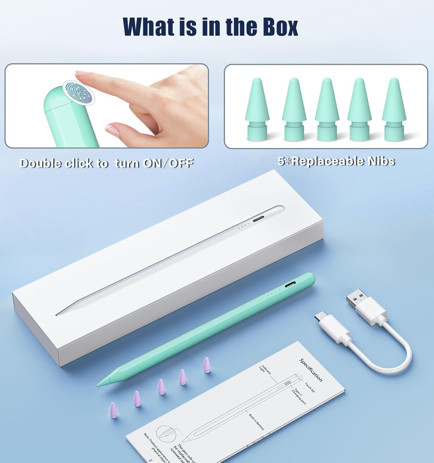 Pencil for Apple Ipad 10Th Generation, 2025-2018 Fast Charge & Palm Rejection Stylus Pen for Ipad 10/9/8/7/6Th Gen, Air 11"-13"/M3/M2/5/4/3Rd, Pro 11"/12.9"/13"/M4, Mini 6/5Th - Mint Green 【Make Sure Your Model】: This iPad Pencil is ONLY compatible with 2018-2024 series ipad models : iPad Pro M4 11-13 inch 2024 New ; iPad Air M2 11-13 inch 2024 New ; iPad Pro 12.9 inch (3rd/4th/5th/6th) ; iPad Pro 11 inch ( 1th/2th/3th/4th) ; iPad (10th/9th/8th/7th/6th) ; iPad Air (3rd/4th/5th) ; iPad Mini (5th/6th Gen). Please confirm your iPad's model name before placing order. 【Fast Charging and Long Usage Time】: This iPad pencil charges fully in 35 minutes and work for 10 hours continuously. It turns off automatically every 90 minutes to save power. This stylus pencil for iPad with a indicator light that provides a clear and convenient power display, avoid automatic shutdown due to lack of power during use. Power display: Four lights on: 75 %-100 % power, Three lights on: 50%-75% power, Two light on: 25 %-50 % power, One light on: less than 25 % power 【Double Tap Turn ON or OFF】: This Pencil for iPad not need Bluetooth connection or App. Just double-tap simply touching the top of the stylus to turn ON/Off and use it directly. If you find it doesn't work after turning on, please turn off Bluetooth: Settings > Bluetooth > Turn off Bluetooth 【Fine Tip and High Sensitivity】: The 1.5mm ultra fine tip can handle finer details without delay. The ultra fine tips offers a smooth and noiseless writing experience. It is very suitable for writing, drawing, detail art work ,playing games which is No lag/No offset/No breaking lines. Comes with 5 replacement nibs, don't worry about wear and tear. [NOTICE] :The stylus pen no pressure-sensitive design 【Support Palm Rejection】: Upgraded stylus pen that allows a device like a tablet to differentiate between a fingertip and a palm or a wrist, effectively “rejecting”unwanted contact. No need to wear anti-friction gloves as you can rest your palm on the screen without worrying about accidental touches for a better-using experience 【What You Get】: 1 Pcs Mint Green Stylus Pen for iPad, 5 Pcs Replacement Nib, 1 Pcs USB-C Cable ,1 Pcs instruction Manual. Warm Tips:We will provide 24 hours online service and life long technical support. If you have any doubts about the quality of the product or the procedure of use, you can tellus at any time, we will be happy to solve the problem for you This iPad Pencil is ONLY compatible with 2018-2024 series ipad models : iPad Pro M4 11-13 inch 2024 New ; iPad Air M2 11-13 inch 2024 New ; iPad Pro 12.9 inch (3rd/4th/5th/6th) ; iPad Pro 11 inch ( 1th/2th/3th/4th) ; iPad (10th/9th/8th/7th/6th) ; iPad Air (3rd/4th/5th) ; iPad Mini (5th/6th Gen). Please confirm your iPad's model name before placing order. Item model number CM-IPAD-BHLV Batteries Required? Yes Are Batteries Included Yes Color D1-Green Material Aluminum Country of Origin China Compatible Devices function(f) {var _np=(window.P._namespace("DetailPageProductOverviewTemplatesJava"));if(_np.guardFatal){_np.guardFatal(f)(_np);}else{f(_np);}}(function(P) { P.when('A').execute(function(A){ A.on('a:truncate:po-attribute-truncate-5:updated', function(data) { var isTruncated = !data.truncateInstance.getIfTextFits(); var seeMoreElement = document.getElementById('po-attribute-see-more-id-5'); if(seeMoreElement) { seeMoreElement.style.display = isTruncated ? '' : 'none'; } }) }); })); Compatible with iPad Pro M4 11-13 inch 2024 New ; iPad Air M2 11-13 inch 2024 New; iPad M4/M2 11-12.9 inch 2024 New, Compatible with Apple iPad Air (3rd/4th/5th) ;Compatible with Apple iPad Mini (5th/6th Gen), Not support iPhone, Android, Microsoft devices and earlier than 2018 version of ipad, Compatible with Apple iPad Pro 12.9 inch (3rd/4th/5th/6th ) & iPad Pro 11 inch ( 1th/2th/3th/4th) ;, Compatible with Apple iPad (10th/9th/8th/7th/6th Gen); See more Item Weight 0.08 Kilograms Batteries 1 Lithium Polymer batteries required. (included) Number of Batteries 1 Lithium Polymer batteries required. (included) Package Dimensions 7.95 x 2.09 x 0.67 inches 2.09 inches x 7.95 inches x 0.67 inches. Weight: 0.08 kg Shipping from the USA All of our products are shipped from the USA, ensuring quick delivery to your destination. Payment We offer the following payment methods: PayPal, credit card, bank transfer, and eBay's secure payment system. Free Shipping & Free Returns Shipping within the USA is FREE. Additionally, any return is absolutely free for you. Risk-Free Purchase You have the option to return an item within 30 days without any justification. We cover the return shipping costs! Fast Shipping We ship immediately upon receipt of payment. Generally, the package is delivered within 2-3 days in the USA. If it takes longer, we will contact you. Quality and Costs Made in Europe, USA, China No customs fees or additional charges Total satisfaction guarantee Invoice with declared VAT available upon request in .pdf format Feedback Your feedback is very important to us. After you pay for your purchase, you will automatically receive positive feedback from us.