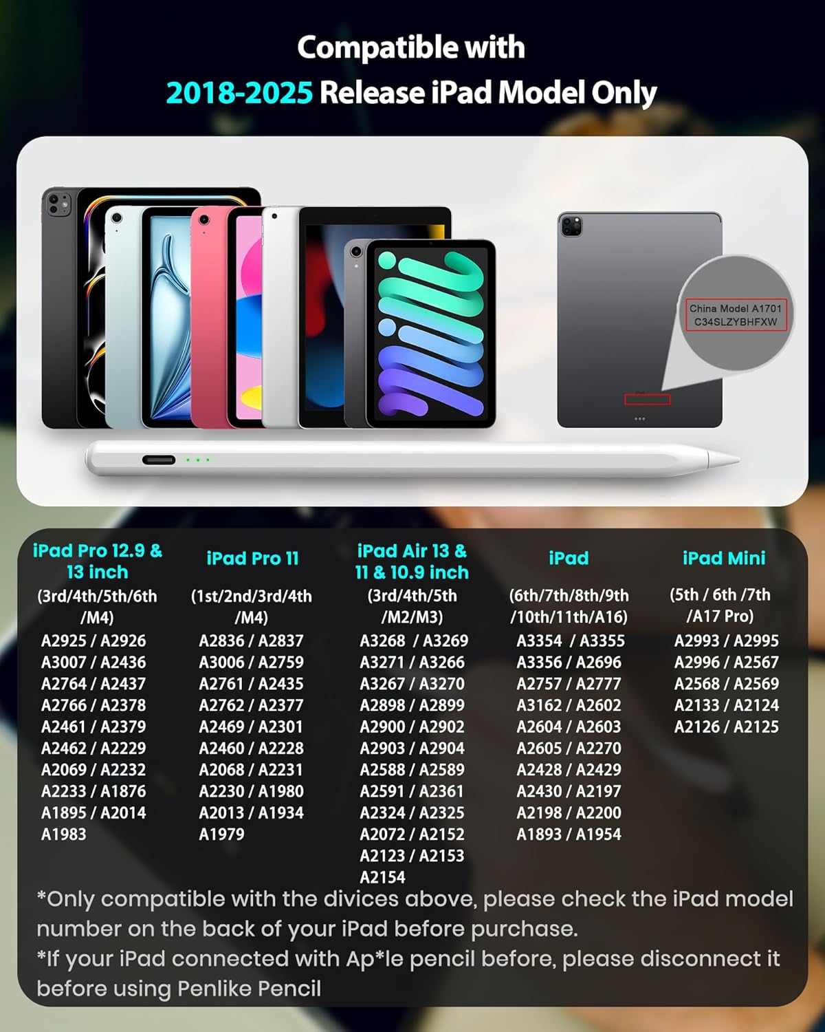 Compatibility: The stylus pencil only works with iPads from 2018 onwards, including iPad Air 11 inch (2025-2024, M3/M2), iPad Air 13 inch (2025-2024, M3/M2), iPad Pro 11 inch (2024, M4), iPad Pro 13 inch (2024, M4), iPad A16/11th (2025), iPad 10th Gen (2022), iPad Pro 11 inch (2022-2018), iPad Pro 12.9 inch (2022-2018), iPad Air 5th/4th/3rd Gen, iPad Mini A17 Pro/7th/6th/5th Gen, and iPad 9th/8th/7th/6th Gen. Note: Please verify your model in [Settings > General > About] before purchasing. Tilt Sensitivity: The iPad Stylus features tilt sensitivity, allowing you to create varying line thicknesses and shadows by adjusting the angle of your pencil for apple ipad 10th generation. Palm Rejection: You can comfortably rest your hand on the screen without gloves while using the stylus pen for ipad. Magnetic Adsorption: The iPad pencil 10th generation magnetically attaches to iPads released from 2018~2025 just like 2nd generation for Apple Pencil. Note: Does not support magnetic charging. Type-C Fast Charging: Fully charges the ipad pencil in just 15 minutes for up to 9 hours of use. Note: Sleeps after 5 minutes of inactivity to save power. Power Display: Easily monitor the reside battery life ipad pencil 9th generation with three indicator lights. Three lights on indicate 60%-100%, two lights on indicate 30%-59%, and one light on indicates below 30% Original Tip: The 1.5mm tip provides pixel-perfect precision and high sensitivity on the iPad, ensuring no delay or interruptions while drawing or writing. Comes with 3 replacement nibs, it’s the perfect alternative to the original 1st generation for apple pencil /2nd generation for apple pencil. Easy to Use: No Bluetooth or WIFI needed. Just tap the top button to turn on. If it doesn’t work, disconnect the iPad and Appl Pencil: Settings > Bluetooth > Appl Pencil > Tap "i" > Forget this device. Also, go to Settings > Notes > turn off "Only Draw with Appl Pencil." Product Description The video showcases the product in use. The video guides you through product setup. The video compares multiple products. The video shows the product being unpacked. Penlike Stylus Pen for iPad Merchant Video