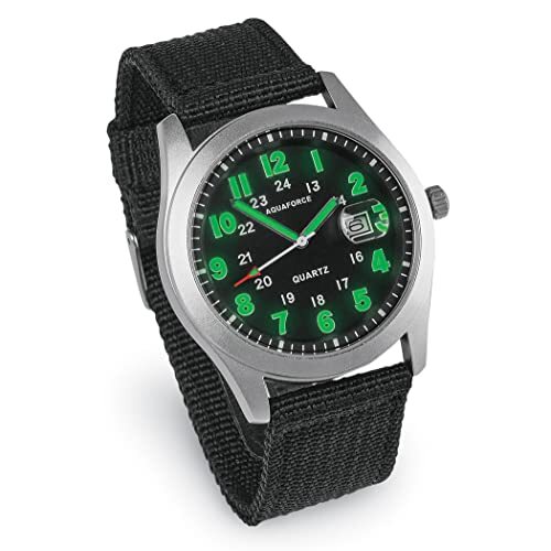 Aquaforce 31-002 Analog Black Dial Combat Military Tactical Watch This product has a Leather-Nylon strap, stainless steal back and 30M Water resistant The face of the watch is black with white numbers and smaller white numbers that mark the 24 hour clock and Date Window Luminous hour markers and hands make it easy to read in the dark, so you can know the time day or night This Aquaforce watch 31-002 has a cool stealthy design and is perfect for police, security, or just everyday wear