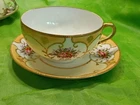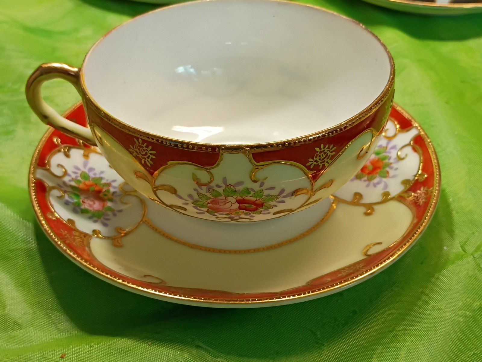 The Ardalt Lenwile Bone China Cups & Saucers are a vintage 12 piece tea cup and saucer set, hand-painted in a floral pattern with a multicolor design. Made in Japan in 1945, this original set features a traditional style and is recommended for hand wash only. Perfect for serving tea or coffee, this set is ideal for collectors or those looking to add a touch of elegance to their kitchen or dining room. The hand-painted details and floral theme make it a charming addition to any tea or coffee service for a service of 6.