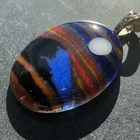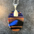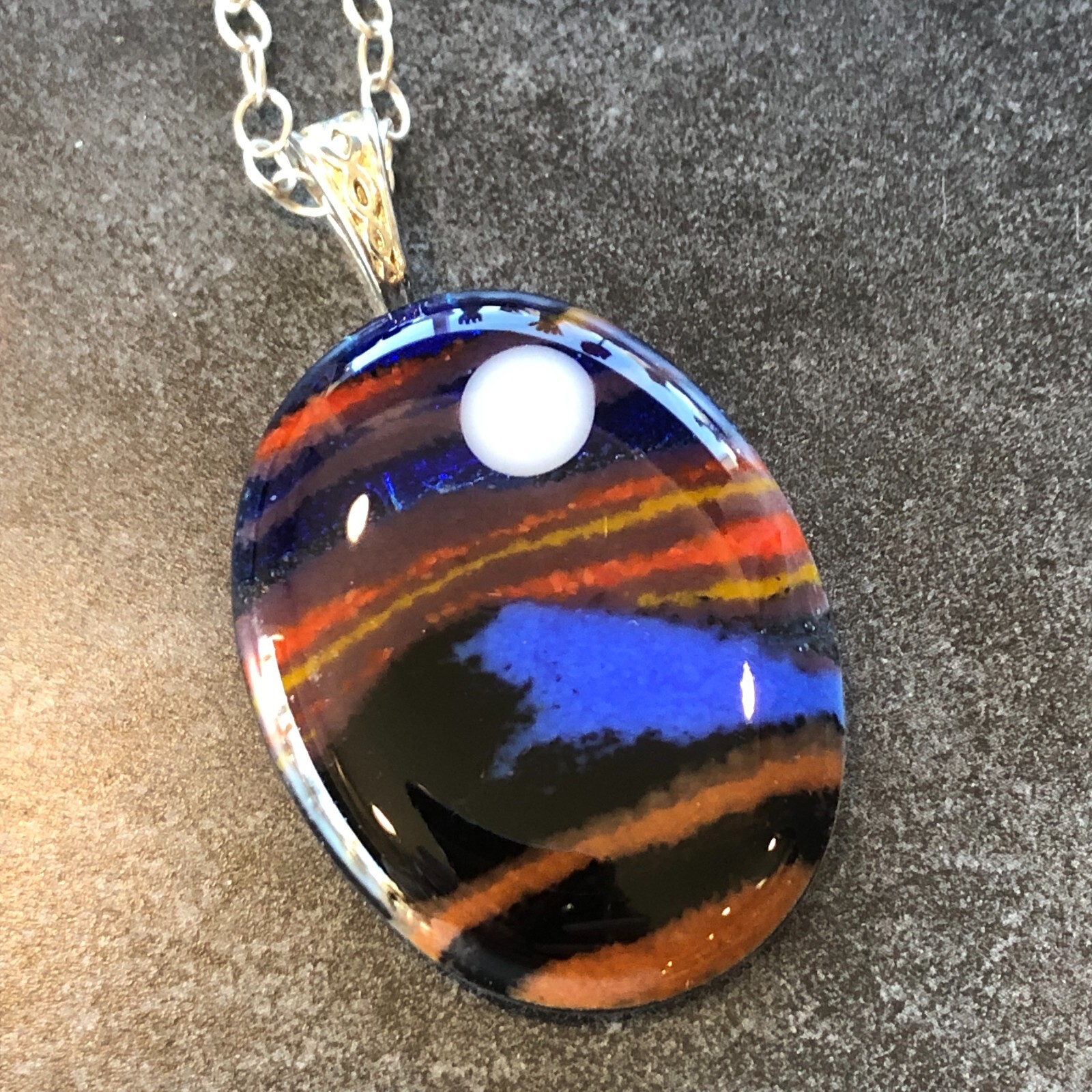 A very beautiful sand sculpture artisan made glass oval pendant on a silver tone 17" chain. This is a really nice piece with a great sunset landscape design - perfect to give as a gift for your favorite someone or keep for yourself! Simple link chain is approx. 17" long, with a 2" tall stunning pendant. This necklace is really lovely. Item is not branded. Chain has a lobster ring clasp. Weighs 0.6 oz. Item is sold in as-is, pre-owned condition with some surface wear but no cracks in the glass. Item has been lightly cleaned. Any additional cleaning or polishing is at the discretion of the buyer. Please see all photos as they are part of the description and show item condition. Ships to you from our smoke free studio. Photos are part of the description. The item you receive will be the exact item pictured.